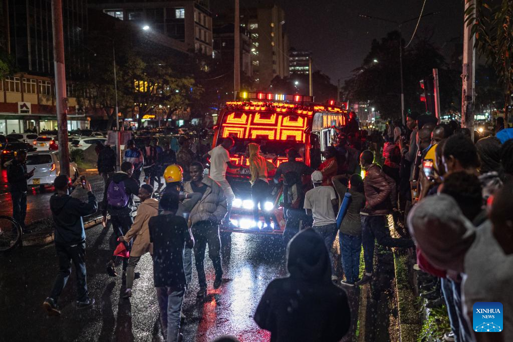 People cheer around a "matatu" as it plays music in Nairobi, Kenya, on July 18, 2025.