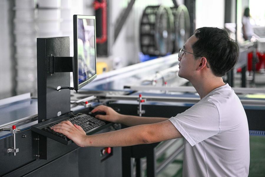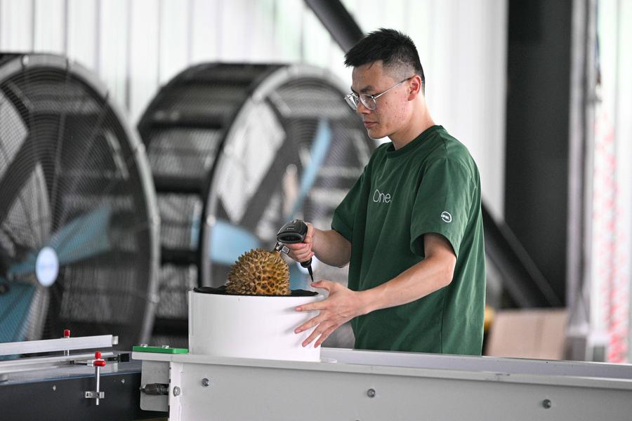 SANYA, July 19 (Xinhua) -- A new AI-powered production line for sorting durians has started operating in Sanya. It can automatically identify the fruit quality and eliminate durians with defects such as insect pests, rot, or immature fruit pulp.