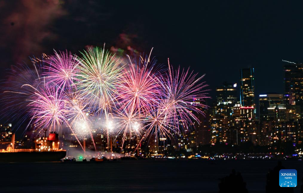 Fireworks light up the sky during the 2025 Celebration of Light at English Bay in Vancouver, British Columbia, Canada, July 19, 2025. The 33rd Celebration of Light fireworks show kicked off here Saturday. This year's event features an all-Canadian lineup, with pyrotechnic teams from Yukon, Quebec, and Nova Scotia scheduled to perform on July 19, 23, and 26, respectively. (Photo by Liang Sen/Xinhua)