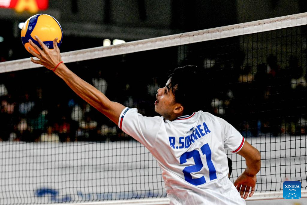Sokchea Ron of Cambodia saves the ball during the match between Indonesia and Cambodia in the 2nd leg of the Men's SEA Volleyball League in Jakarta, Indonesia, July 19, 2025. (Xinhua/Agung Kuncahya B.)