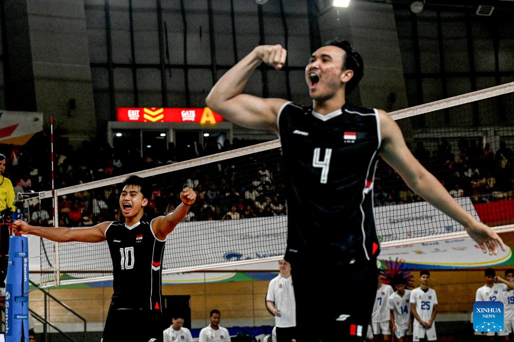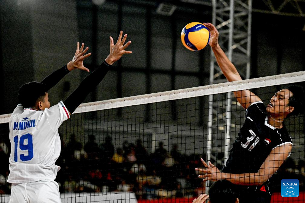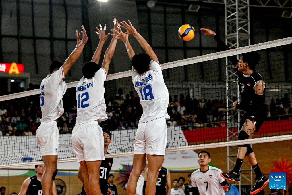 Boy Arnez Arabi (1st R) of Indonesia spikes the ball during the match between Indonesia and Cambodia in the 2nd leg of the Men's SEA Volleyball League in Jakarta, Indonesia, July 19, 2025. (Xinhua/Agung Kuncahya B.)