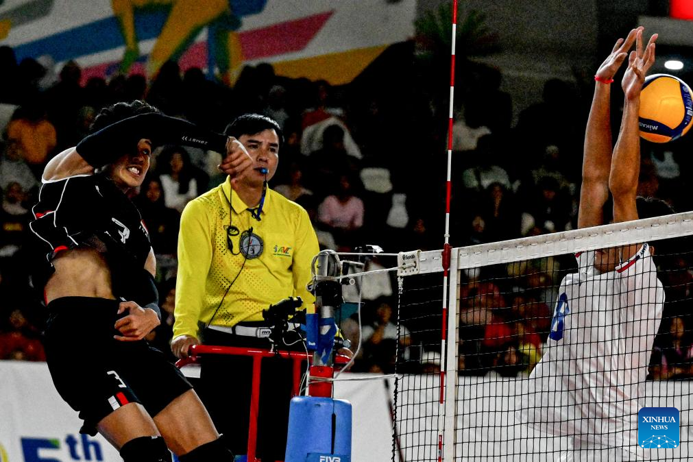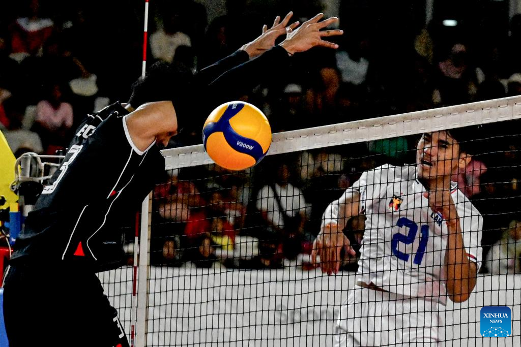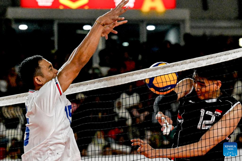 Sokchea Ron (R) of Cambodia spikes the ball against Boy Arnez Arabi of Indonesia during the match between Indonesia and Cambodia in the 2nd leg of the Men's SEA Volleyball League in Jakarta, Indonesia, July 19, 2025. (Xinhua/Agung Kuncahya B.)