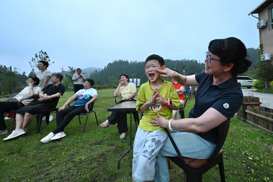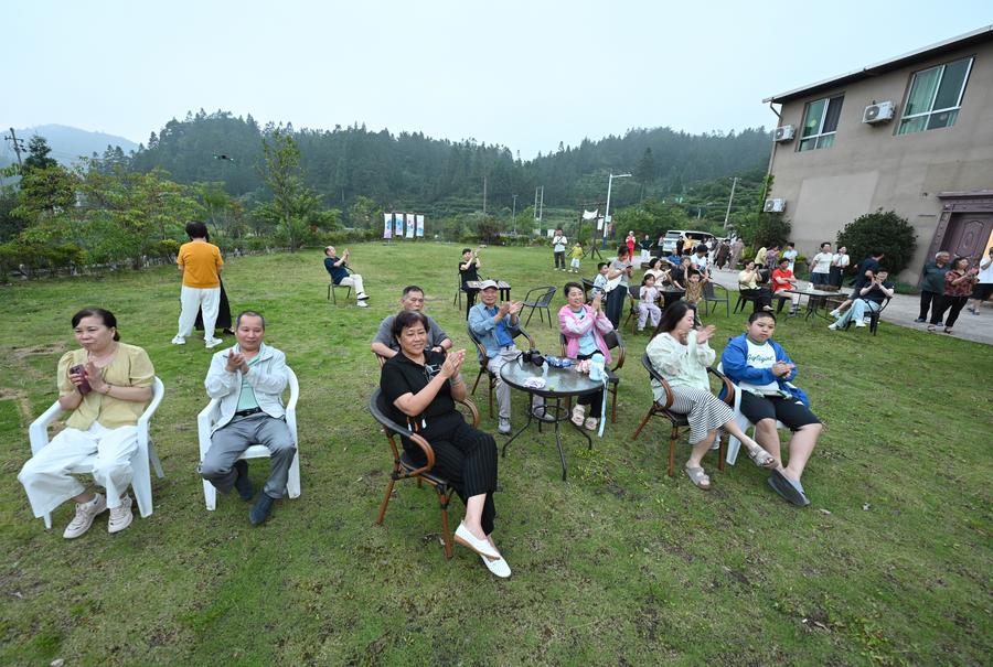 Tourists enjoy themselves on a lawn at Ziyun Village, Puyuan Township, Zhouning County, southeast China's Fujian Province, July 17, 2025. (Xinhua/Jiang Kehong)