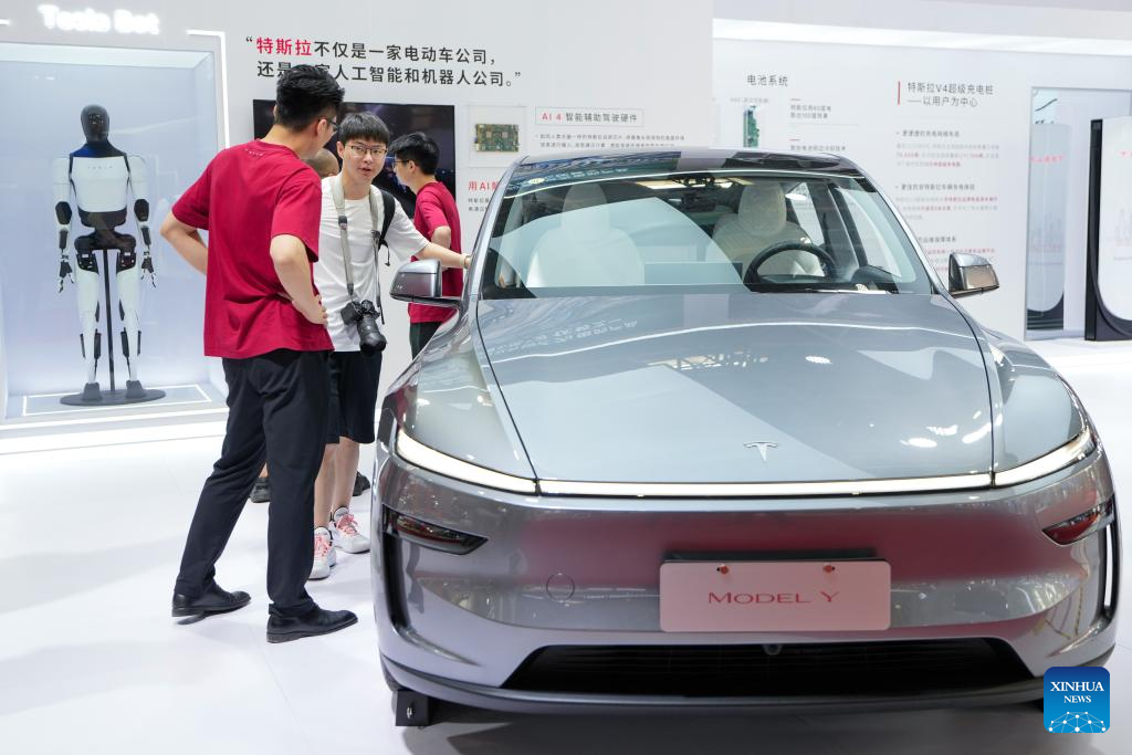 Visitors view U.S. EV giant Tesla's Model Y at the Smart Vehicle Chain area of the third China International Supply Chain Expo (CISCE) in Beijing, capital of China, July 19, 2025. At the Smart Vehicle Chain area of the third CISCE, more than 30 domestic and foreign enterprises and institutions showcased key technologies and products of the EV industry chain, demonstrating the achievements of the collaborative innovation in the sector.