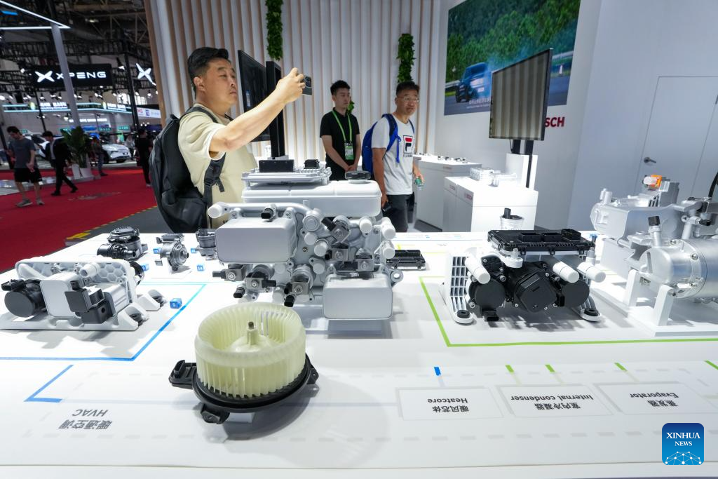 People learn about the thermal management system solutions at the booth of Bosch in the Smart Vehicle Chain area of the third China International Supply Chain Expo (CISCE) in Beijing, capital of China, July 19, 2025. At the Smart Vehicle Chain area of the third CISCE, more than 30 domestic and foreign enterprises and institutions showcased key technologies and products of the EV industry chain, demonstrating the achievements of the collaborative innovation in the sector.