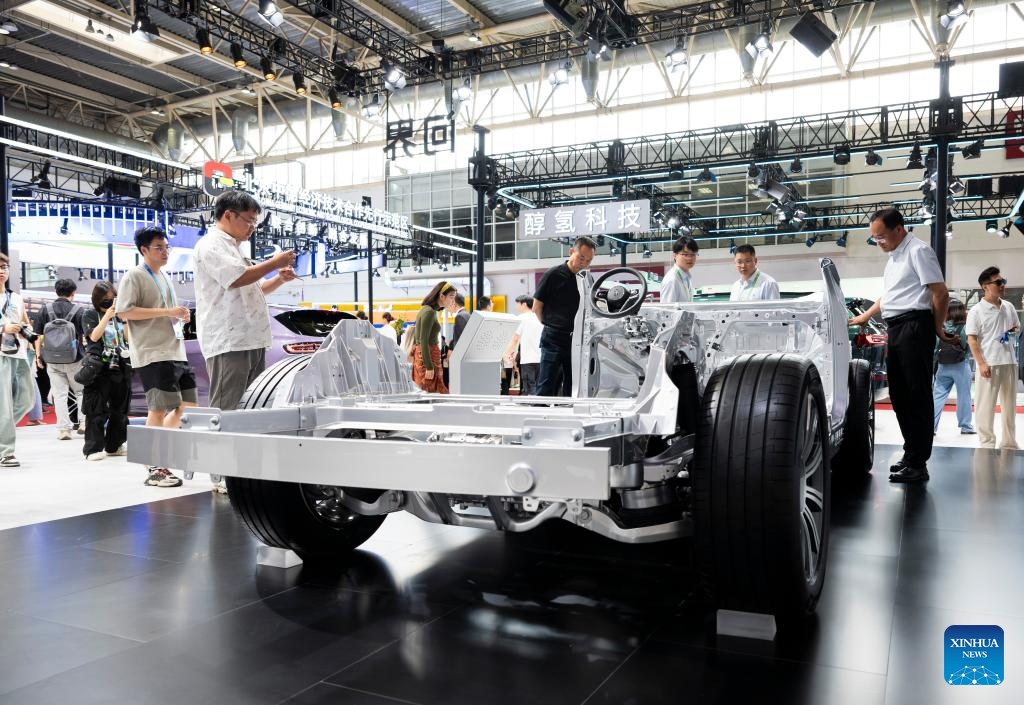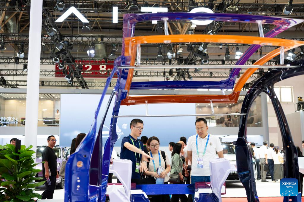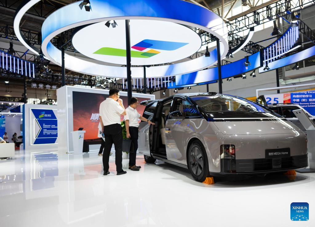 People visit the Smart Vehicle Chain area of the third China International Supply Chain Expo (CISCE) in Beijing, capital of China, July 16, 2025. At the Smart Vehicle Chain area of the third CISCE, more than 30 domestic and foreign enterprises and institutions showcased key technologies and products of the EV industry chain, demonstrating the achievements of the collaborative innovation in the sector.