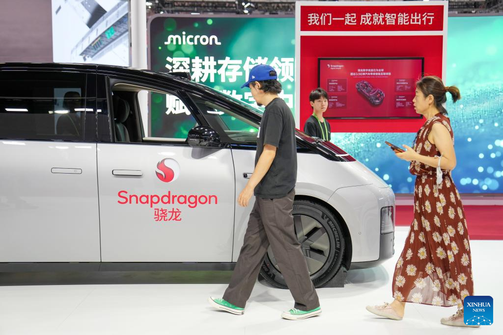 People view an electric vehicle of Li Auto equipped with Snapdragon digital cockpit platform at the booth of Qualcomm in the Digital Technology Chain area of the third China International Supply Chain Expo (CISCE) in Beijing, capital of China, July 17, 2025. At the Smart Vehicle Chain area of the third CISCE, more than 30 domestic and foreign enterprises and institutions showcased key technologies and products of the EV industry chain, demonstrating the achievements of the collaborative innovation in the sector.
