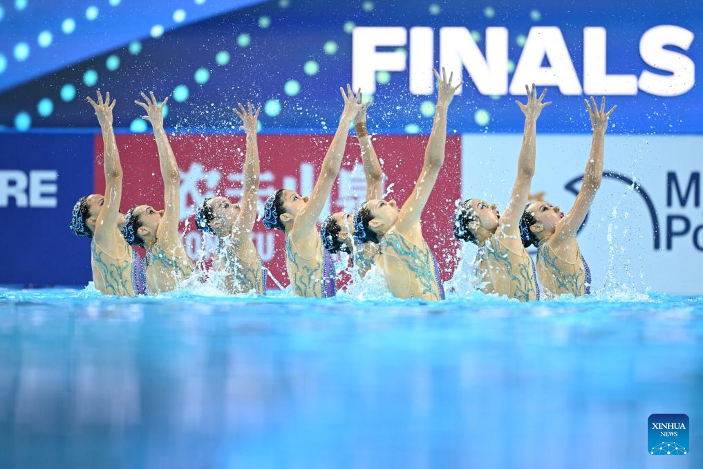 Team China perform during the team free final of artistic swimming at the World Aquatics Championships in Singapore, July 20, 2025. (Xinhua/Xue Yuge)
