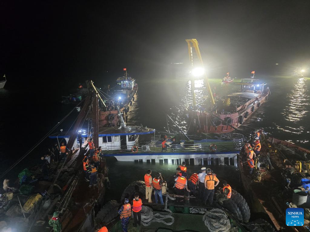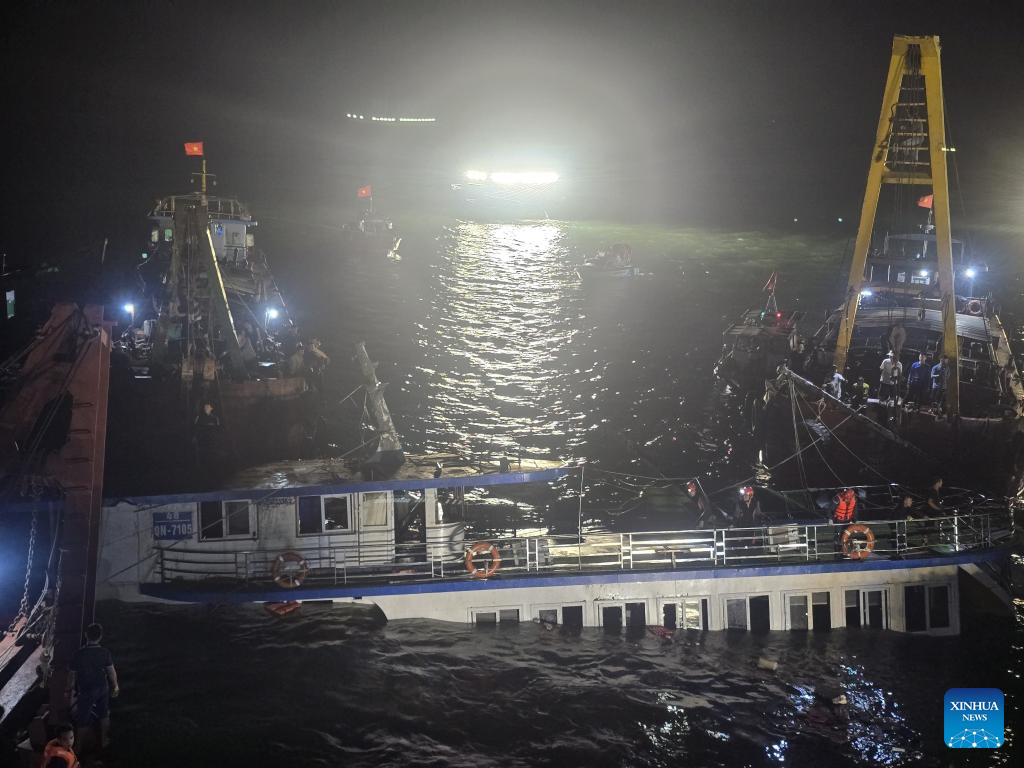 Rescuers work at the capsizing site of a cruise ship in Ha Long Bay, northern Vietnam's Quang Ninh province, July 20, 2025. The death toll has risen to 37 after a cruise ship capsized in Ha Long Bay, northern Vietnam's Quang Ninh province, on Saturday afternoon, Vietnam News Agency reported. (VNA/Handout via Xinhua)