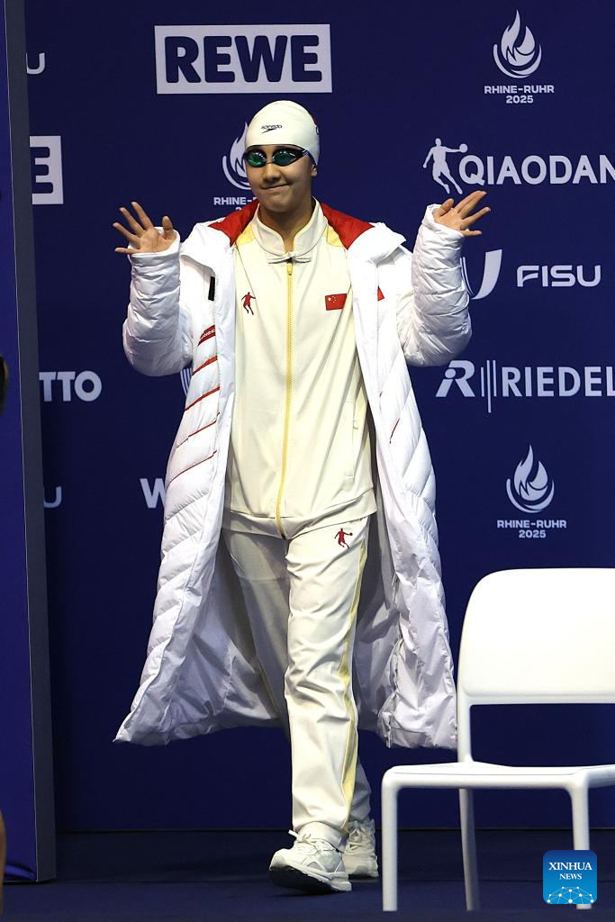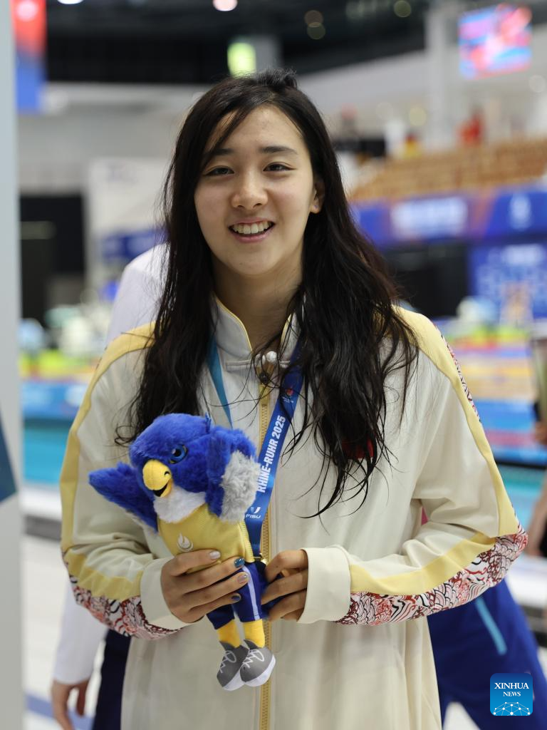 Ai Yanhan of China receives an interview after the women's 100m freestyle final of swimming at the Rhine-Ruhr 2025 FISU World University Games in Berlin, Germany, July 19, 2025. (Xinhua/Du Zheyu)