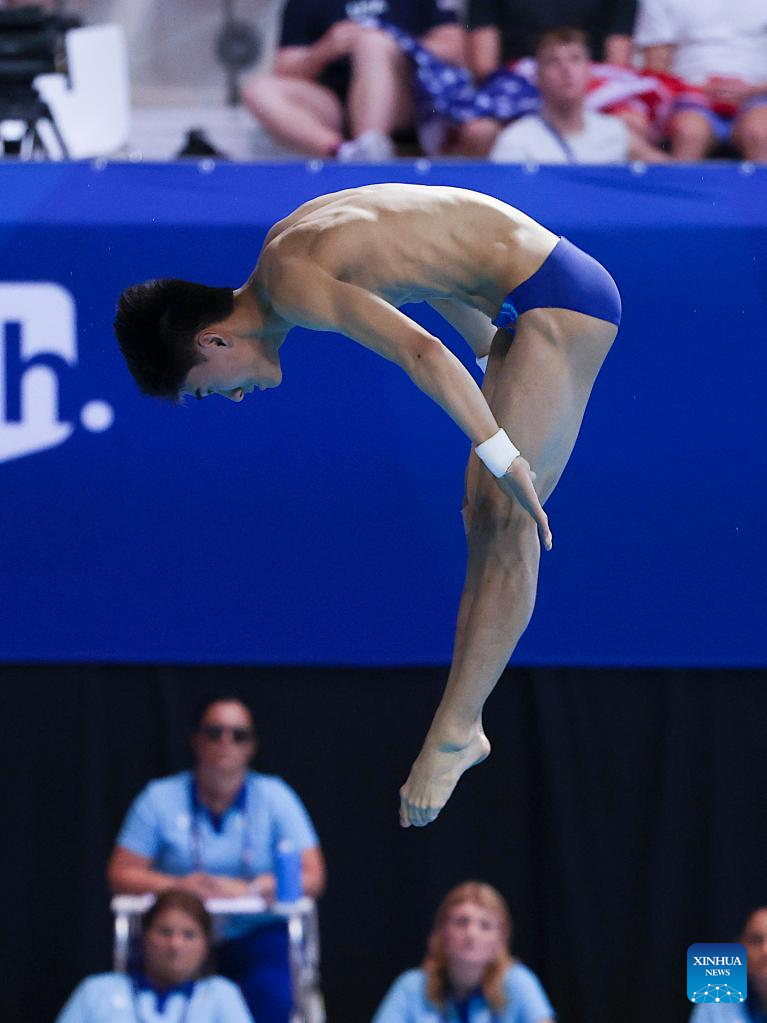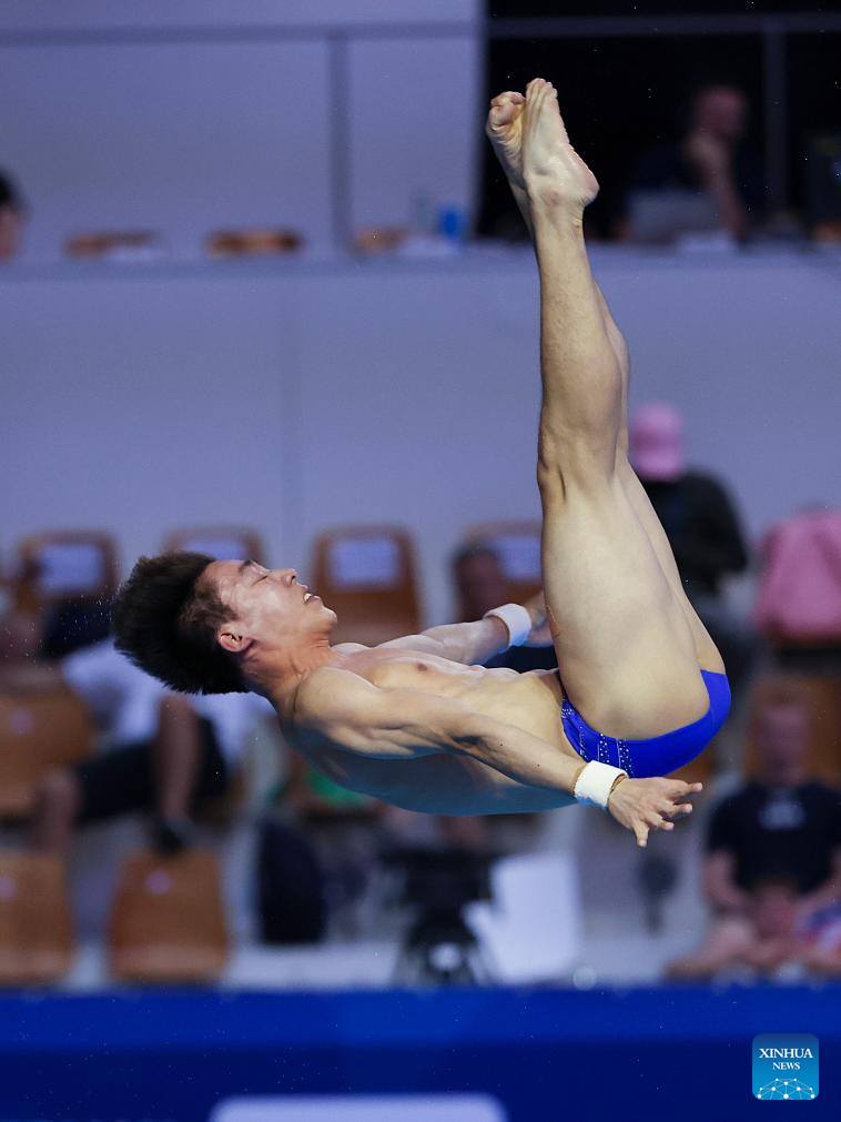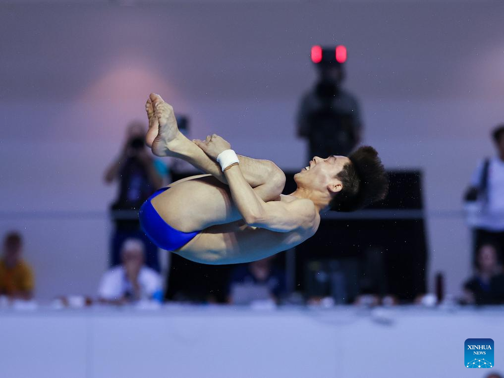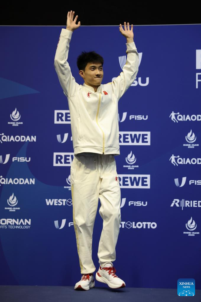 Zheng Junzhi of China competes during the men's 10m platform final of diving at the Rhine-Ruhr 2025 FISU World University Games in Berlin, Germany, July 19, 2025. (Xinhua/Du Zheyu)