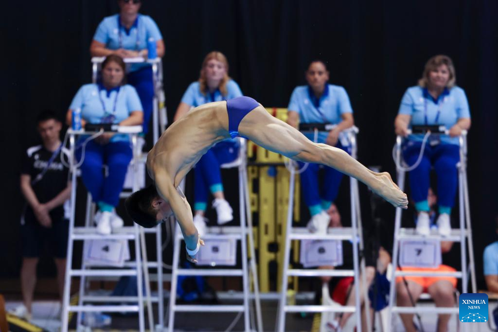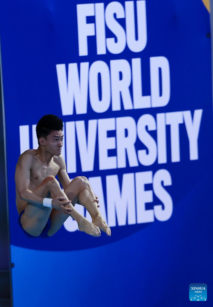 Mo Yonghua of China competes during the men's 10m platform final of diving at the Rhine-Ruhr 2025 FISU World University Games in Berlin, Germany, July 19, 2025. (Xinhua/Du Zheyu)