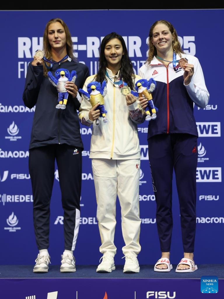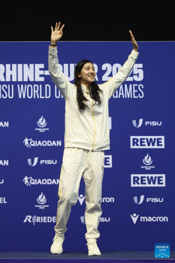 Gold medalist Ai Yanhan of China poses during the awarding ceremony for the women's 100m freestyle final of swimming at the Rhine-Ruhr 2025 FISU World University Games in Berlin, Germany, July 19, 2025. (Xinhua/Du Zheyu)