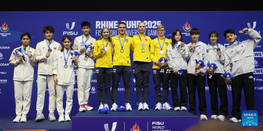 Gold medalists team Germany (C), silver medalists team China (L) and bronze medalists team South Korea pose during the awarding ceremony for the mixed 3m & 10m team final of diving at the Rhine-Ruhr 2025 FISU World University Games in Berlin, Germany, July 19, 2025. (Xinhua/Du Zheyu)