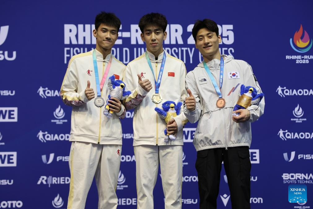 Gold medalist Zheng Junzhi (C) of China, sliver medalist Mo Yonghua (L) of China and bronze medalist Kim Yeongtaek of South Korea pose during the awarding ceremony for the men's 10m platform final of diving at the Rhine-Ruhr 2025 FISU World University Games in Berlin, Germany, July 19, 2025. (Xinhua/Du Zheyu)