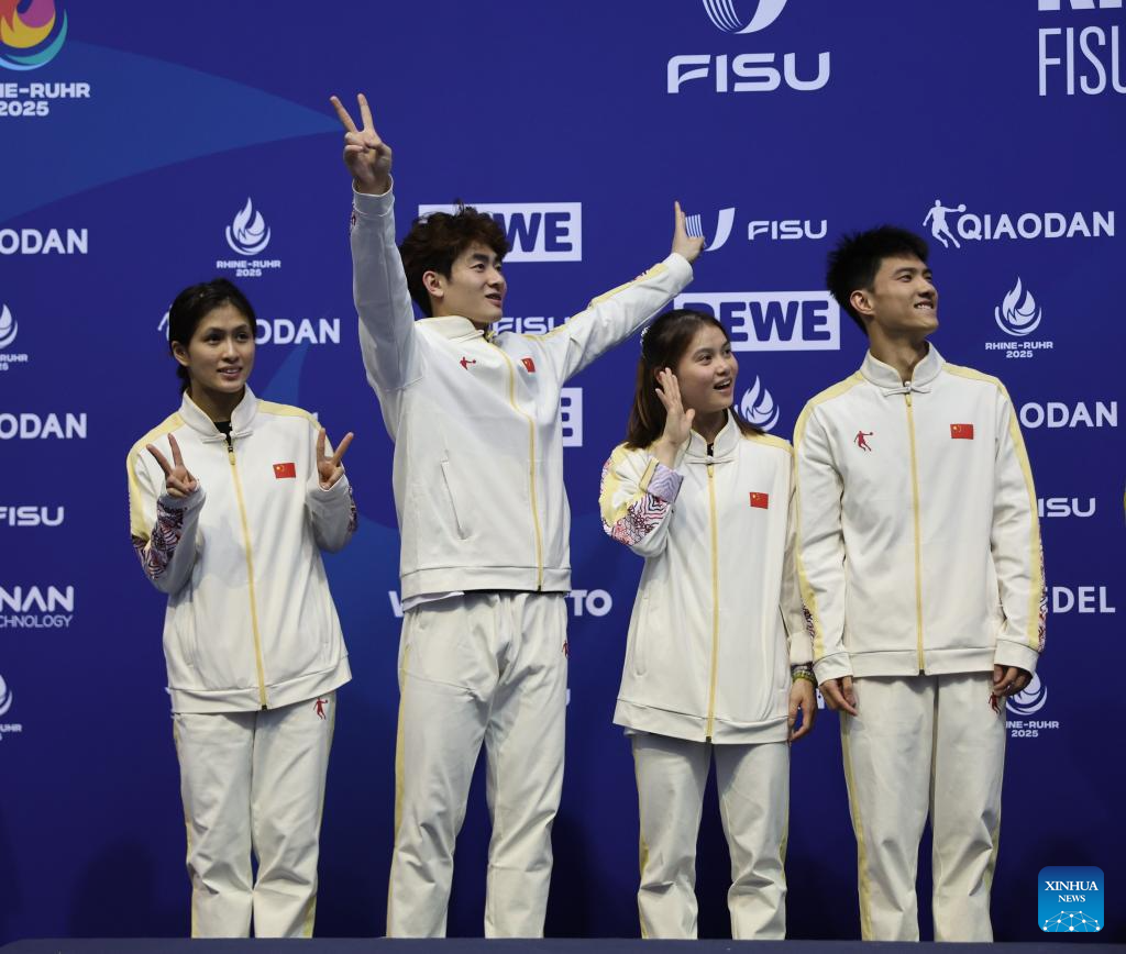 Qu Zhixin, Mo Zhengxiong, He Yanwei and Mo Yonghua (from L to R) of China celebrate during the awarding ceremony for the mixed 3m & 10m team final of diving at the Rhine-Ruhr 2025 FISU World University Games in Berlin, Germany, July 19, 2025. (Xinhua/Du Zheyu)
