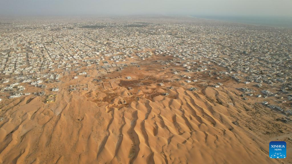 An aerial drone photo taken on June 17, 2025 shows sand dunes and the cityscape in Nouakchott, Mauritania. Nouakchott, on the edge of the Sahara Desert, is the capital of Mauritania and its political, economic, and cultural center. (Xinhua/Si Yuan)