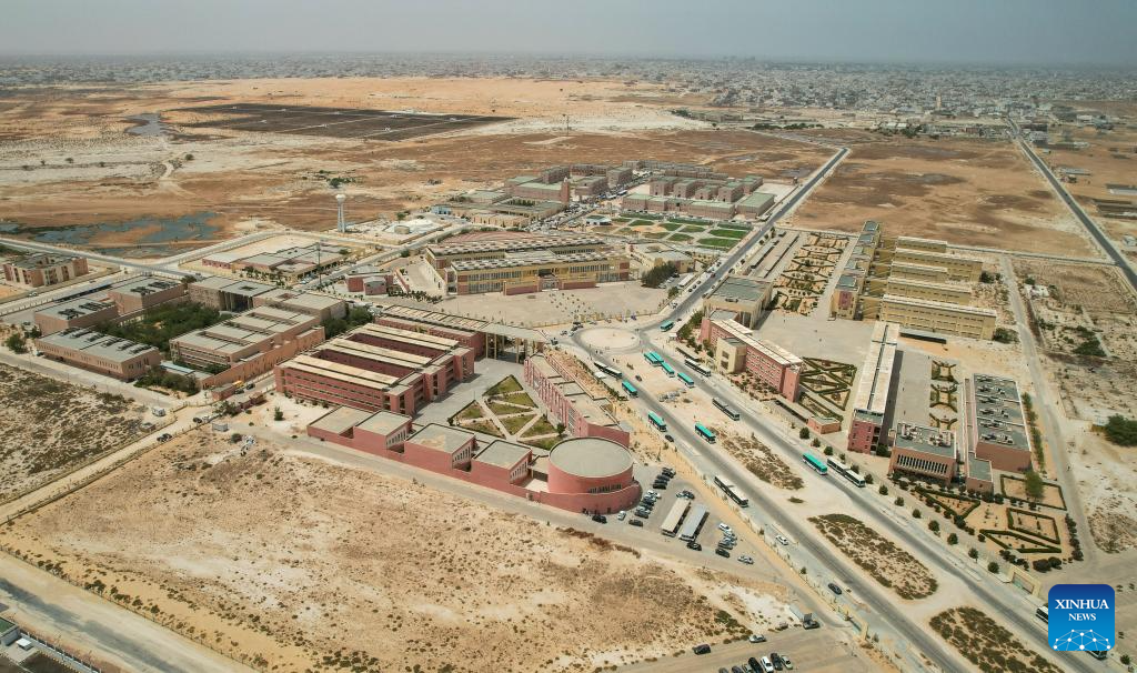 An aerial drone photo taken on June 17, 2025 shows a view of the University of Nouakchott in Nouakchott, Mauritania. Nouakchott, on the edge of the Sahara Desert, is the capital of Mauritania and its political, economic, and cultural center. (Xinhua/Si Yuan)