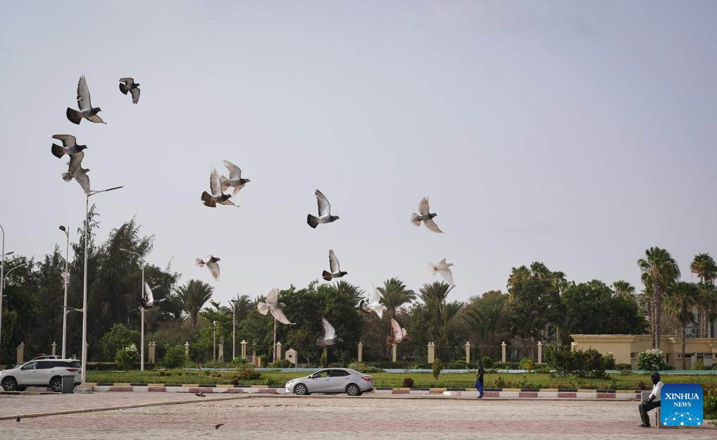 Pigeons fly over the Liberty Park in Nouakchott, Mauritania, on July 14, 2025. Nouakchott, on the edge of the Sahara Desert, is the capital of Mauritania and its political, economic, and cultural center. (Xinhua/Han Xu)