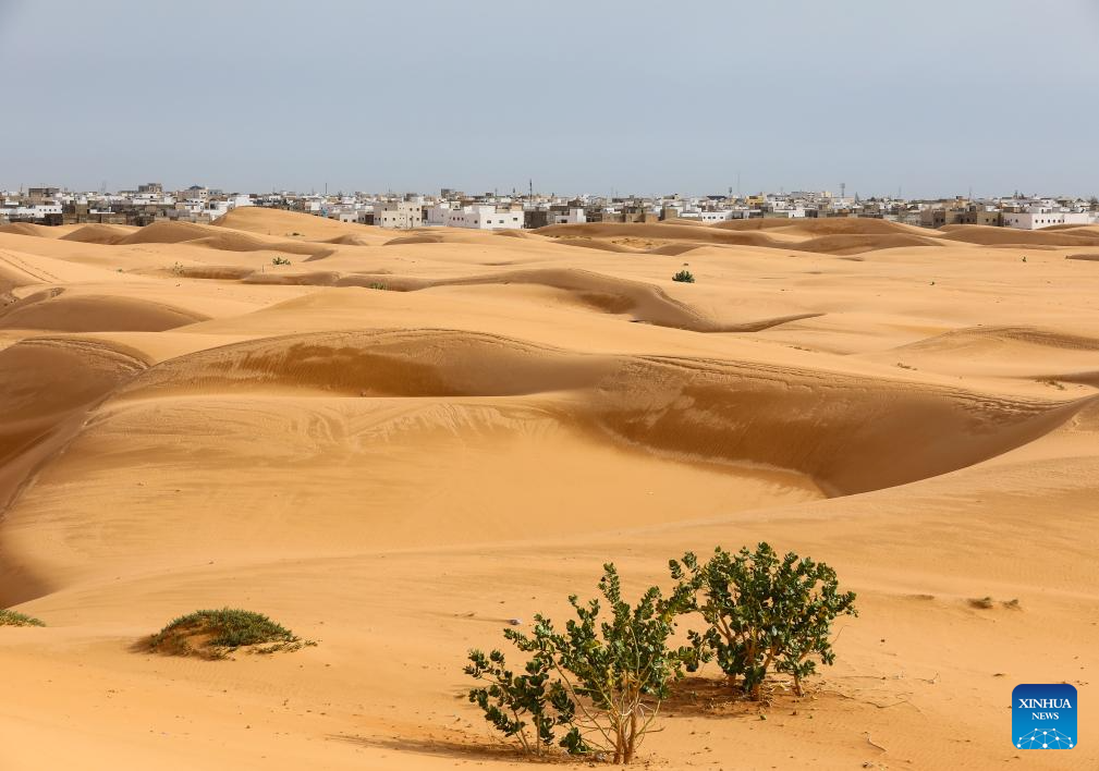 This photo taken on July 17, 2025 shows sand dunes and the cityscape in Nouakchott, Mauritania. Nouakchott, on the edge of the Sahara Desert, is the capital of Mauritania and its political, economic, and cultural center. (Xinhua/Han Xu)