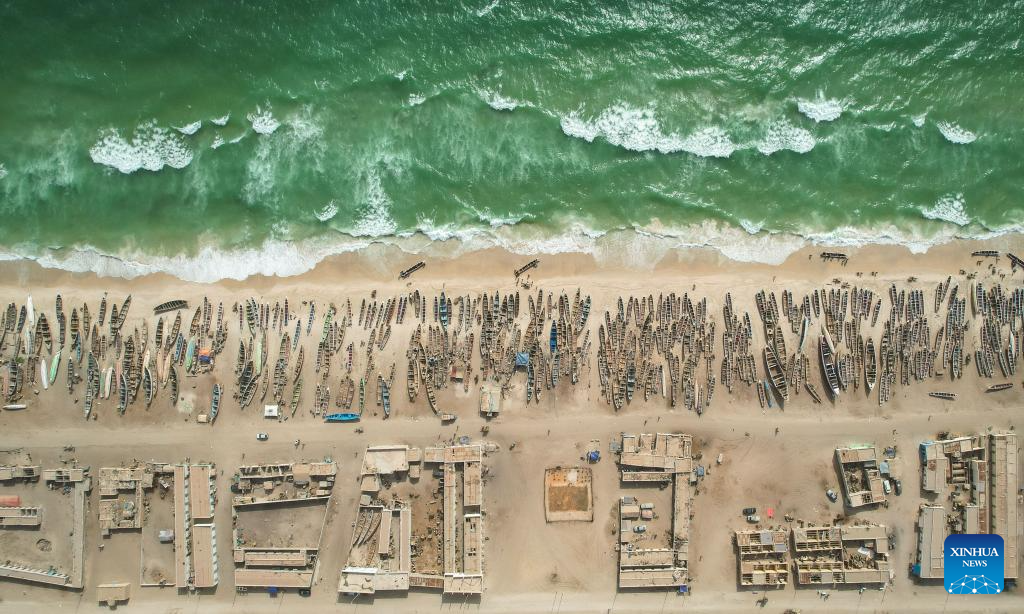 An aerial drone photo taken on June 17, 2025 shows the view of a fishing port in Nouakchott, Mauritania. Nouakchott, on the edge of the Sahara Desert, is the capital of Mauritania and its political, economic, and cultural center. (Xinhua/Si Yuan)