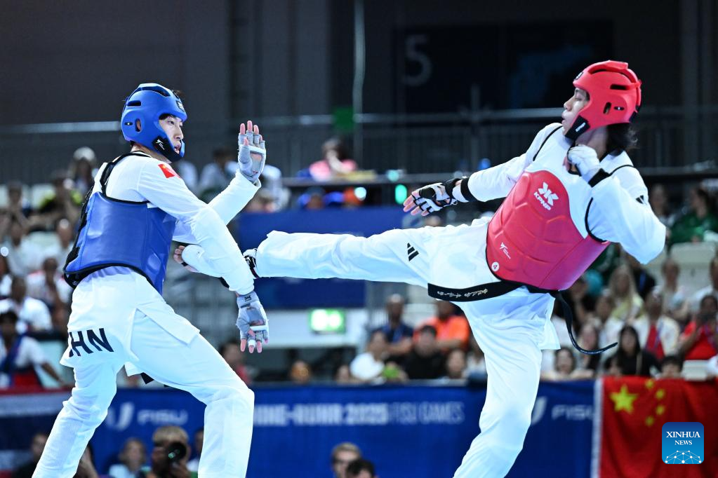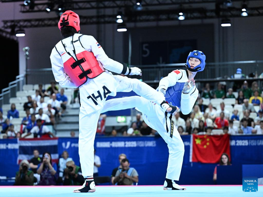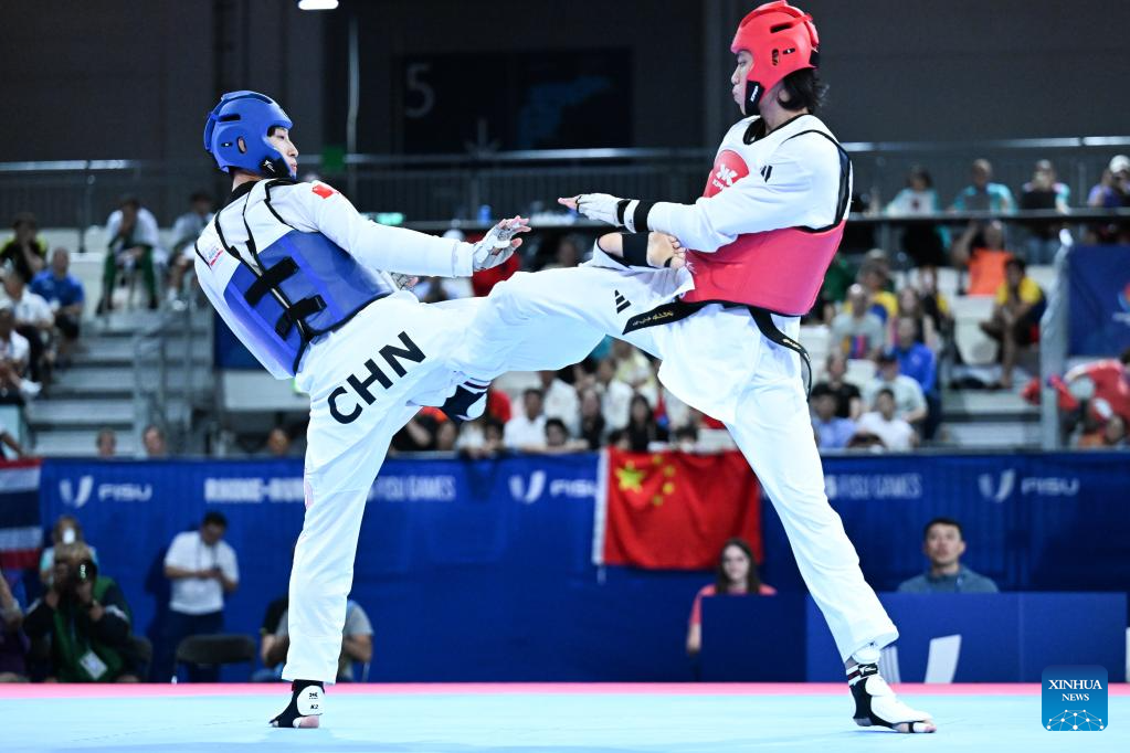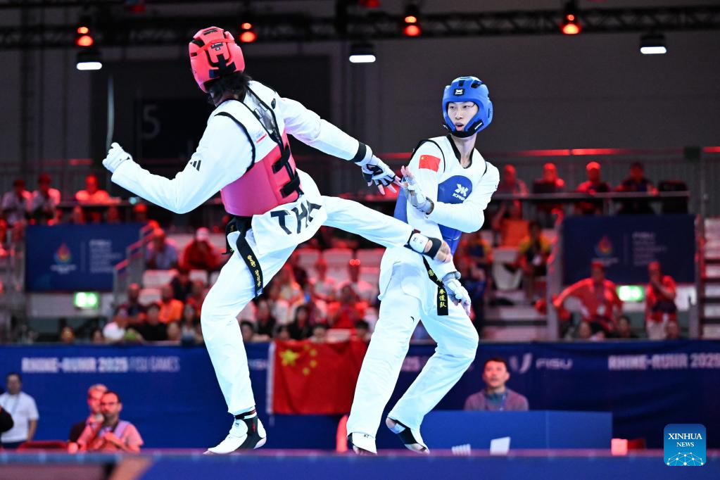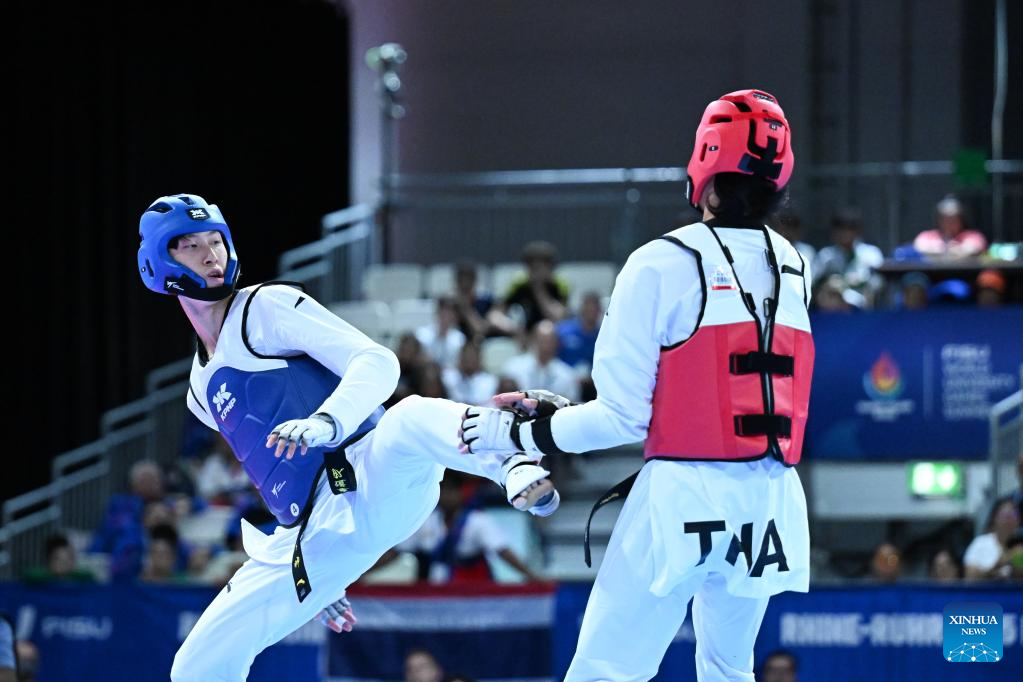 Liang Yushuai (L) of China competes with Banlung Tubtimdang of Thailand during the men's 68kg final of taekwondo at the Rhine-Ruhr 2025 FISU World University Games in Essen, Germany, July 19, 2025. (Xinhua/Lian Yi)