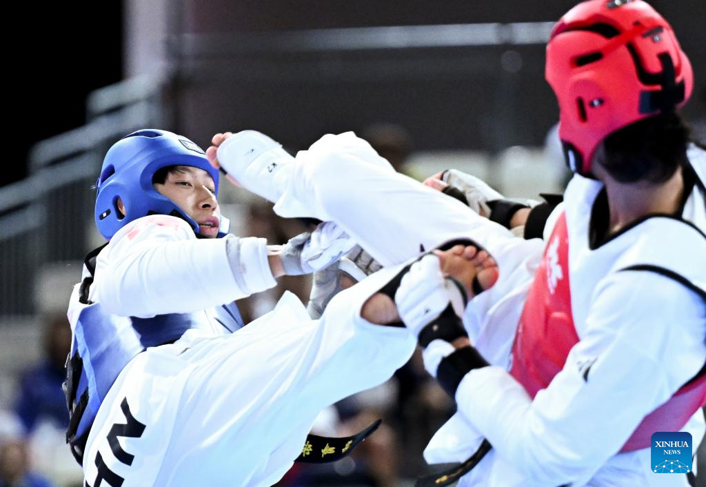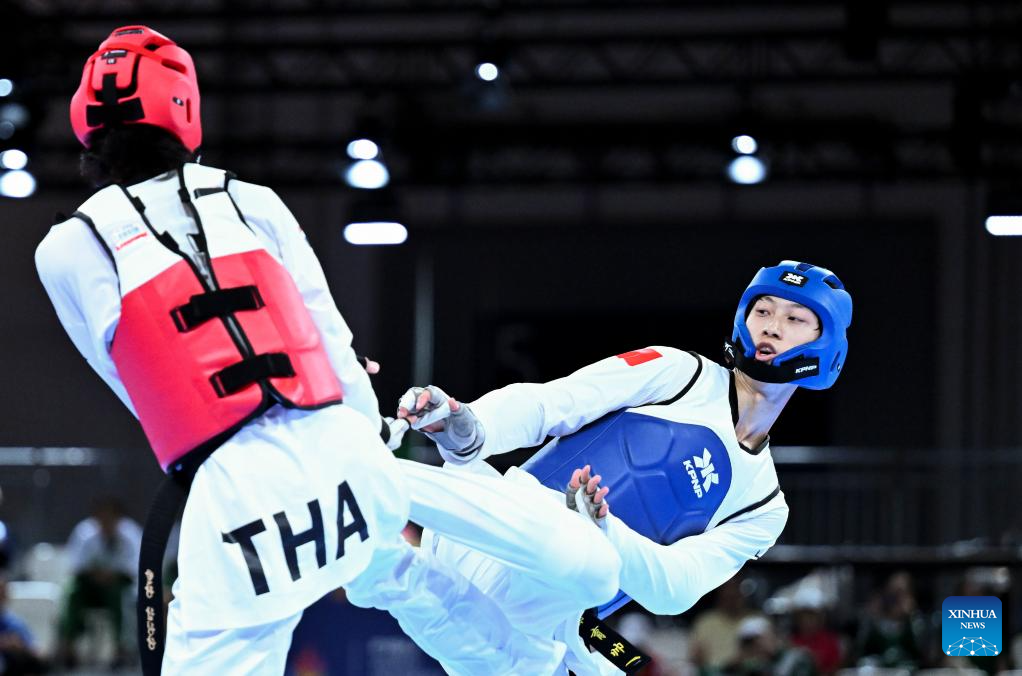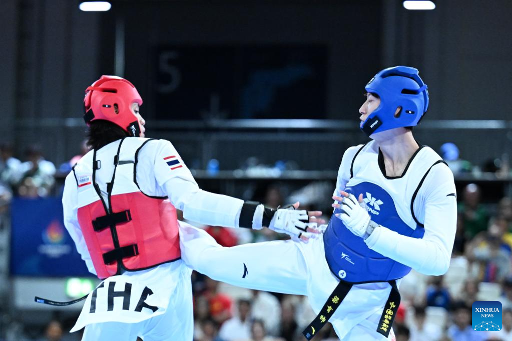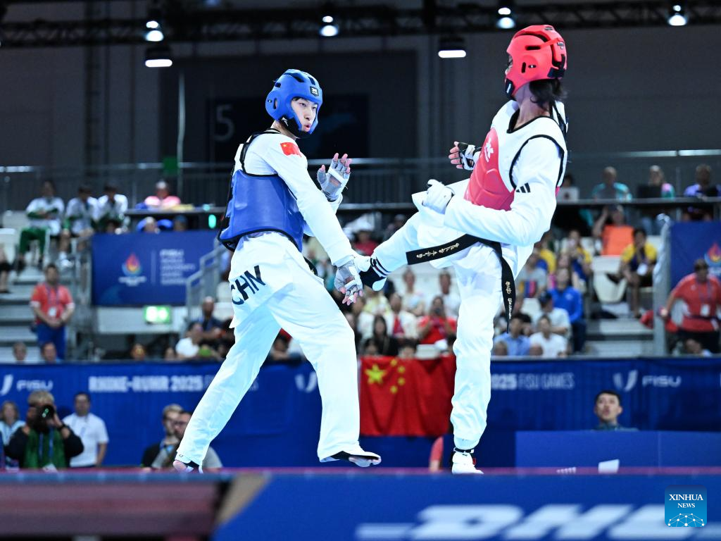 Liang Yushuai (L) of China competes with Banlung Tubtimdang of Thailand during the men's 68kg final of taekwondo at the Rhine-Ruhr 2025 FISU World University Games in Essen, Germany, July 19, 2025. (Xinhua/Lian Yi)