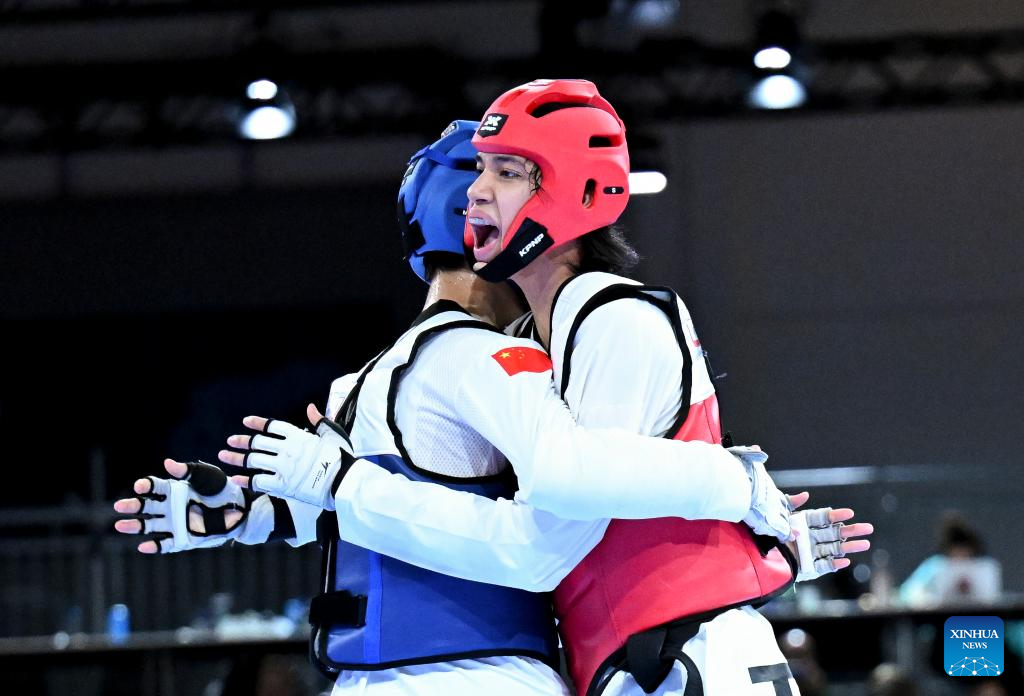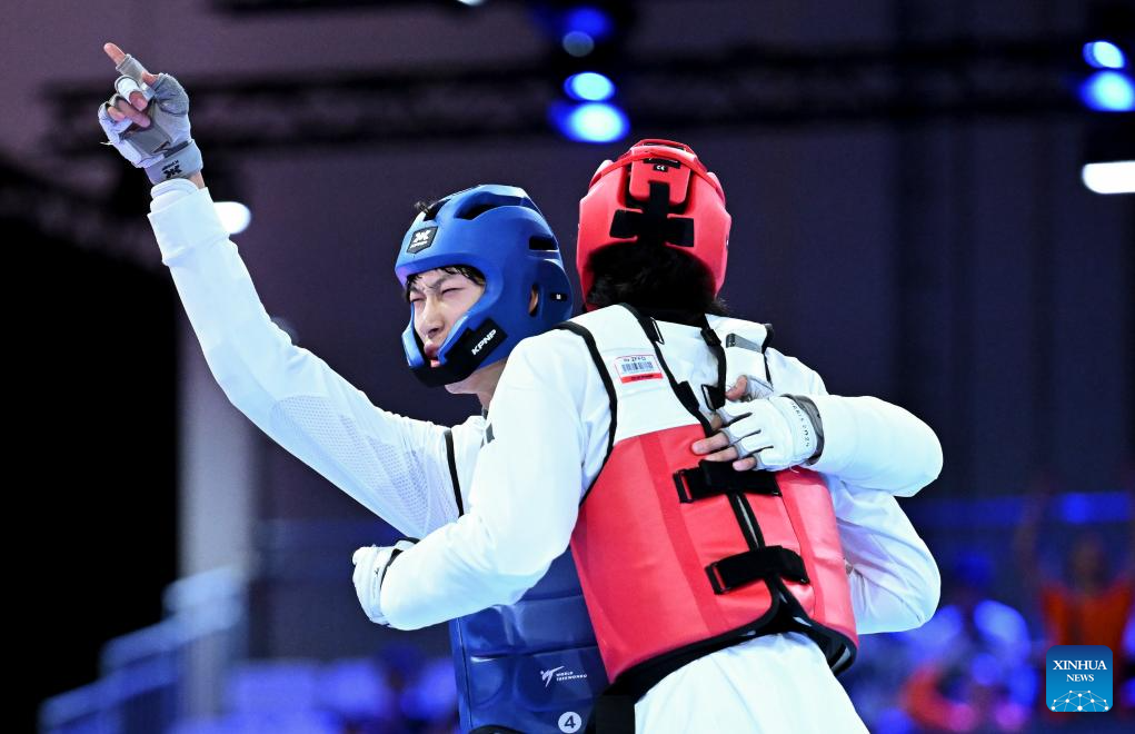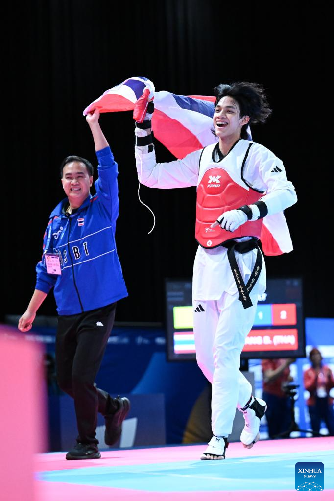 Banlung Tubtimdang (R) of Thailand celebrates after winning the men's 68kg final of taekwondo at the Rhine-Ruhr 2025 FISU World University Games in Essen, Germany, July 19, 2025. (Xinhua/Lian Yi)