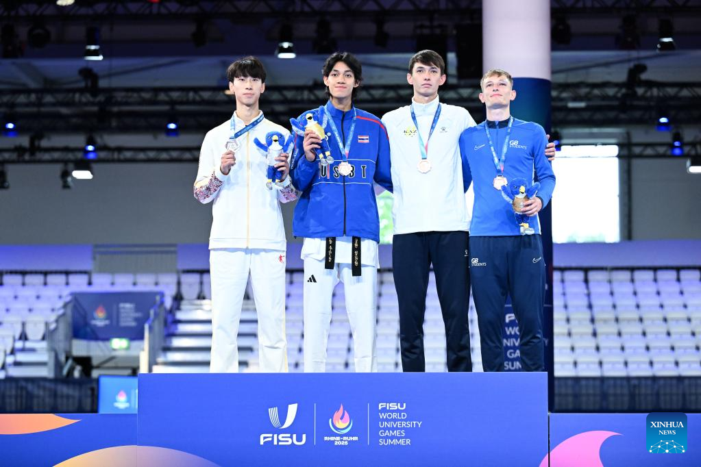 Gold medalist Banlung Tubtimdang (2nd L) of Thailand, silver medalist Liang Yushuai (1st L) of China, bronze medalist Damir Shulenov of Kazakhstan (2nd R) and Matthew Timothy Howell of Britain pose during the awarding ceremony for the men's 68kg final of taekwondo at the Rhine-Ruhr 2025 FISU World University Games in Essen, Germany, July 19, 2025. (Xinhua/Lian Yi)
