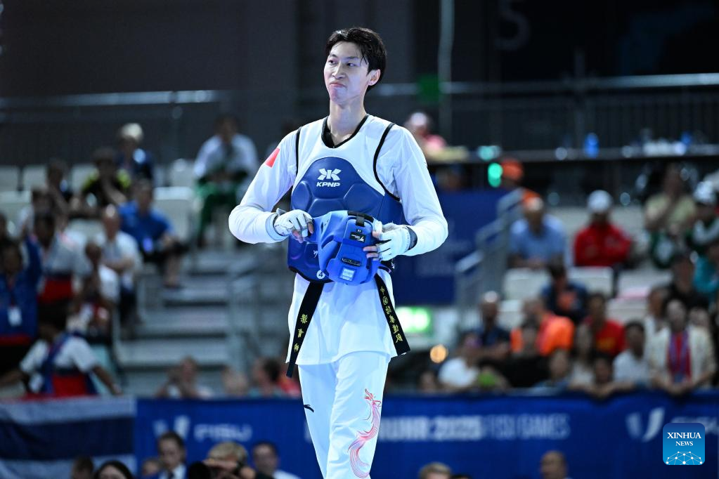 Liang Yushuai of China reacts after the men's 68kg final of taekwondo at the Rhine-Ruhr 2025 FISU World University Games in Essen, Germany, July 19, 2025. (Xinhua/Lian Yi)