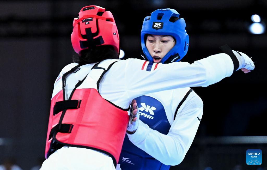 Banlung Tubtimdang (R) of Thailand competes with Liang Yushuai of China during the men's 68kg final of taekwondo at the Rhine-Ruhr 2025 FISU World University Games in Essen, Germany, July 19, 2025. (Xinhua/Lian Yi)