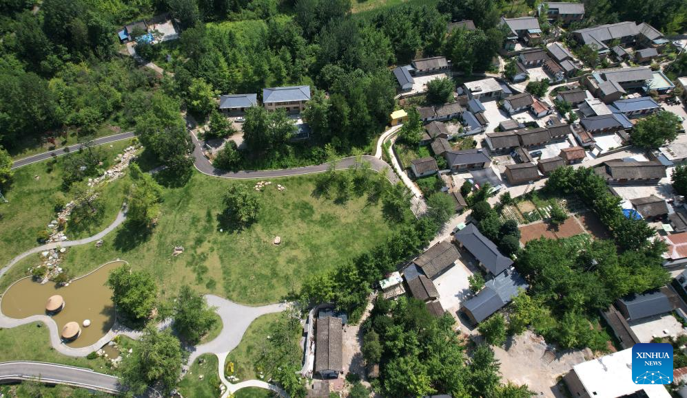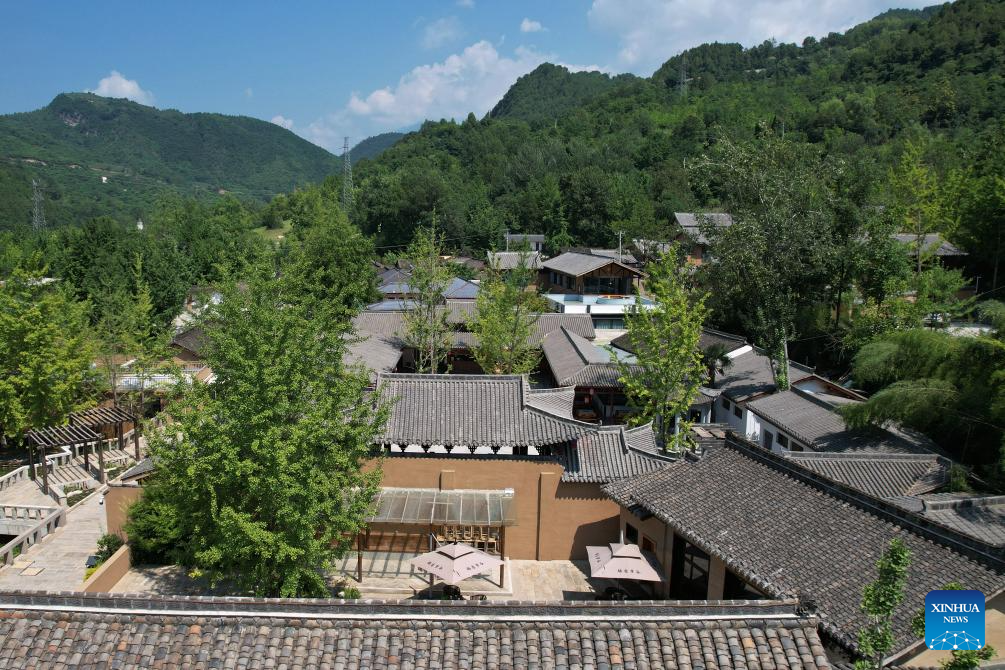 An aerial drone photo taken on July 15, 2025 shows a homestay at Tianhe Village, Jialing Town of Huixian County, northwest China's Gansu Province. (Xinhua/Chen Bin)