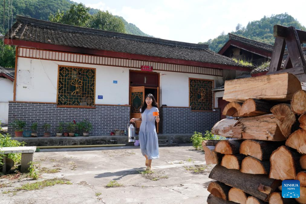 Zhou Yaxue, a homestay manager, tides up tea sets in a guest room at Tianhe Village, Jialing Town of Huixian County, northwest China's Gansu Province, on July 15, 2025. (Xinhua/Chen Bin)