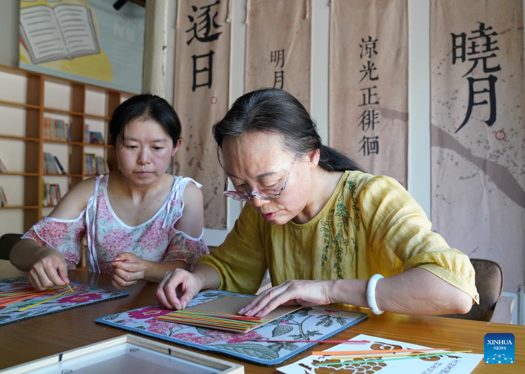 Staff members of a homestay Zhang Xiaoqing (R) and Man Juan make cultural and creative products of bamboo weaving at an intangible cultural heritage inheritance experience center in Tianhe Village, Jialing Town of Huixian County, northwest China's Gansu Province, on July 15, 2025. (Xinhua/Ma Ning)