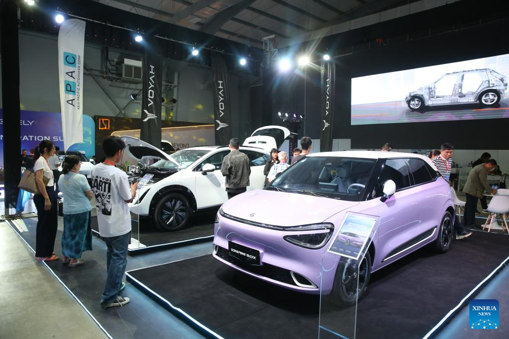 People visit the exhibition area of the Myanmar International Auto Expo 2025 in Yangon, Myanmar, July 18, 2025. The three-day Myanmar International Auto Expo 2025, held from Friday to Sunday, brought together over 30 brands, most of them Chinese.(Xinhua/Myo Kyaw Soe)