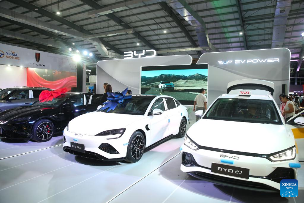 People visit the booth of BYD during the Myanmar International Auto Expo 2025 in Yangon, Myanmar, July 18, 2025. The three-day Myanmar International Auto Expo 2025, held from Friday to Sunday, brought together over 30 brands, most of them Chinese.(Xinhua/Myo Kyaw Soe)