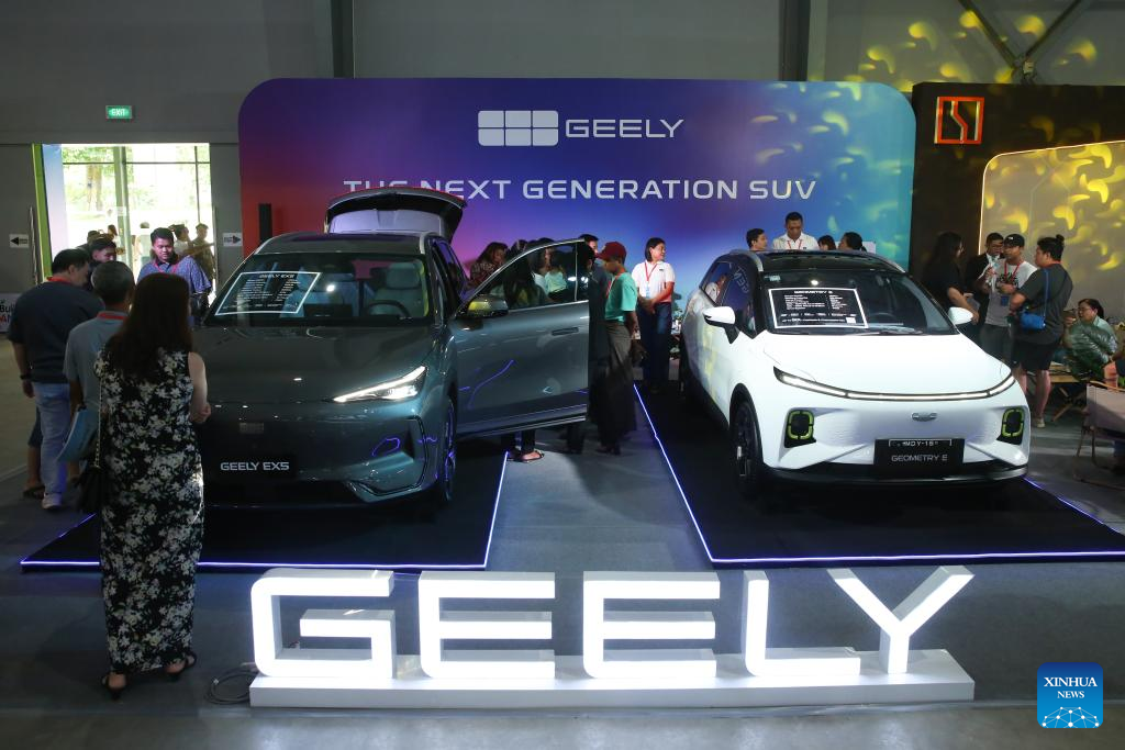 People visit the the booth of Geely during the Myanmar International Auto Expo 2025 in Yangon, Myanmar, July 18, 2025. The three-day Myanmar International Auto Expo 2025, held from Friday to Sunday, brought together over 30 brands, most of them Chinese.(Xinhua/Myo Kyaw Soe)