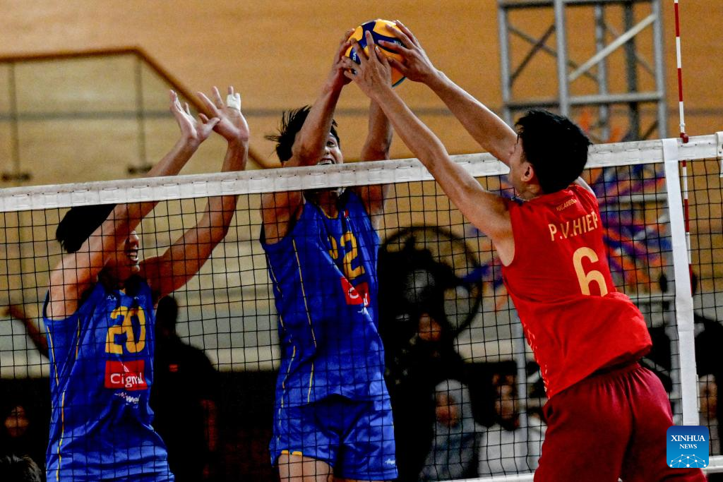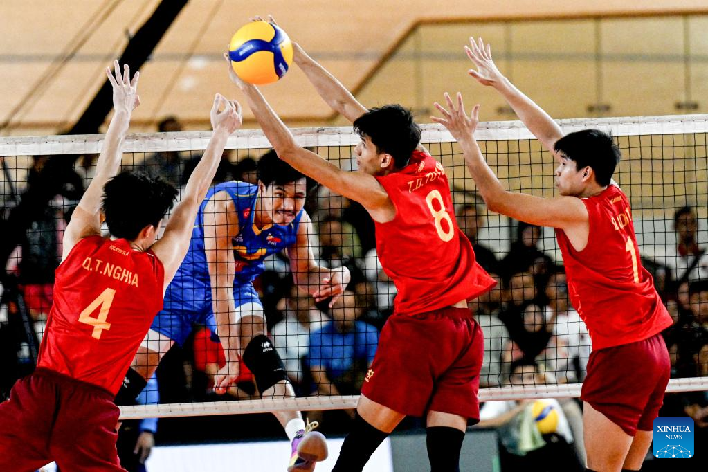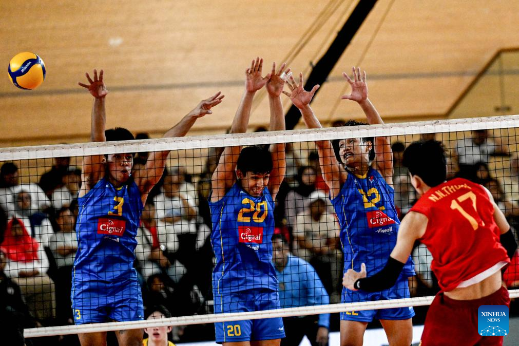 Jade Alex Disquitado (2nd L) of the Philippines spikes the ball during the match between Vietnam and the Philippines in the 2nd leg of the Men's SEA Volleyball League in Jakarta, Indonesia, July 20, 2025. (Xinhua/Agung Kuncahya B.)