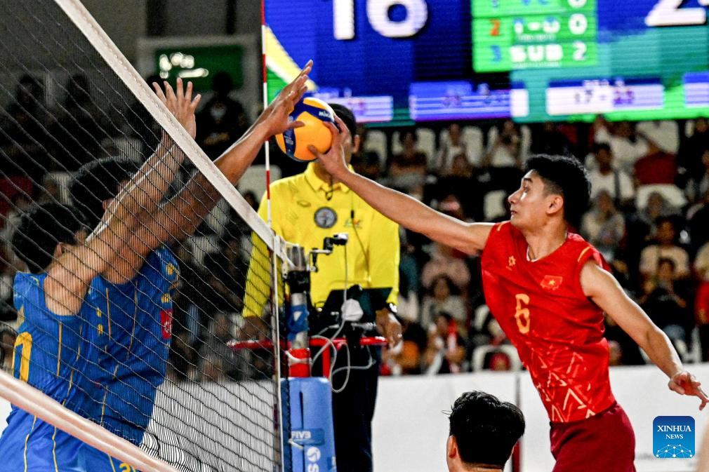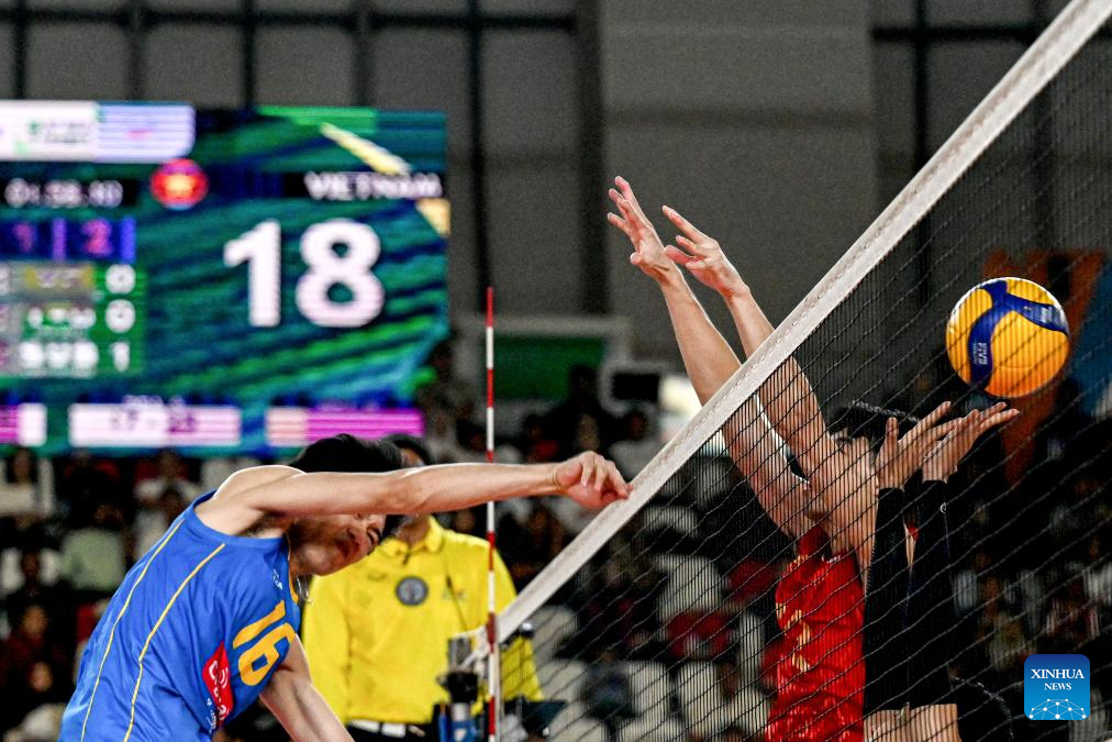 Hiep Pham (R) of Vietnam spikes the ball during the match between Vietnam and the Philippines in the 2nd leg of the Men's SEA Volleyball League in Jakarta, Indonesia, July 20, 2025. (Xinhua/Agung Kuncahya B.)