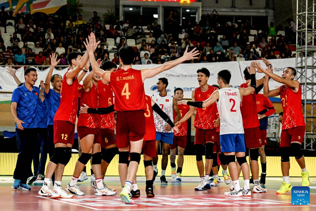 Players of Vietnam celebrate after the match between Vietnam and the Philippines in the 2nd leg of the Men's SEA Volleyball League in Jakarta, Indonesia, July 20, 2025. (Xinhua/Agung Kuncahya B.)