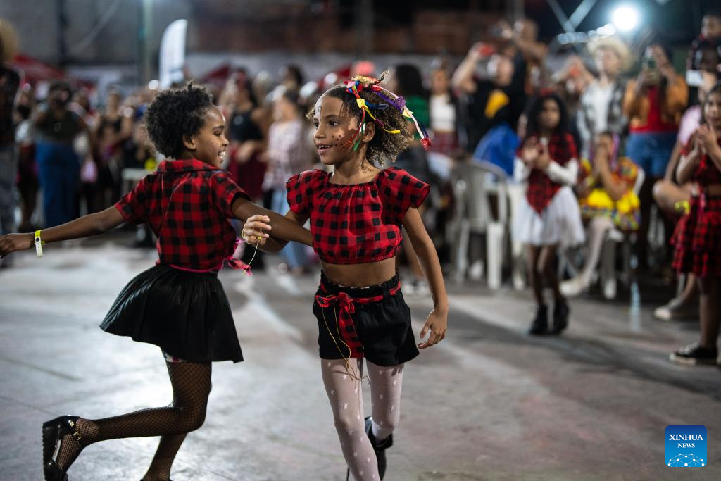 Children dance together during a celebration of harvest in the Manguinhos community in Rio de Janeiro, Brazil, July 19, 2025. (Xinhua/Wang Tiancong)