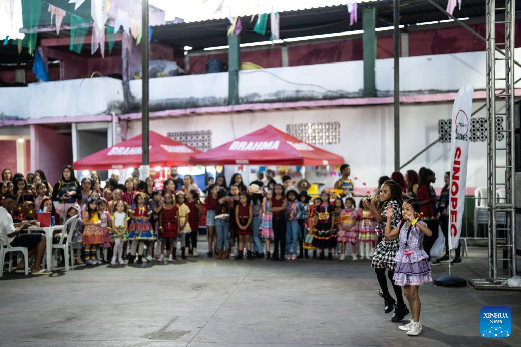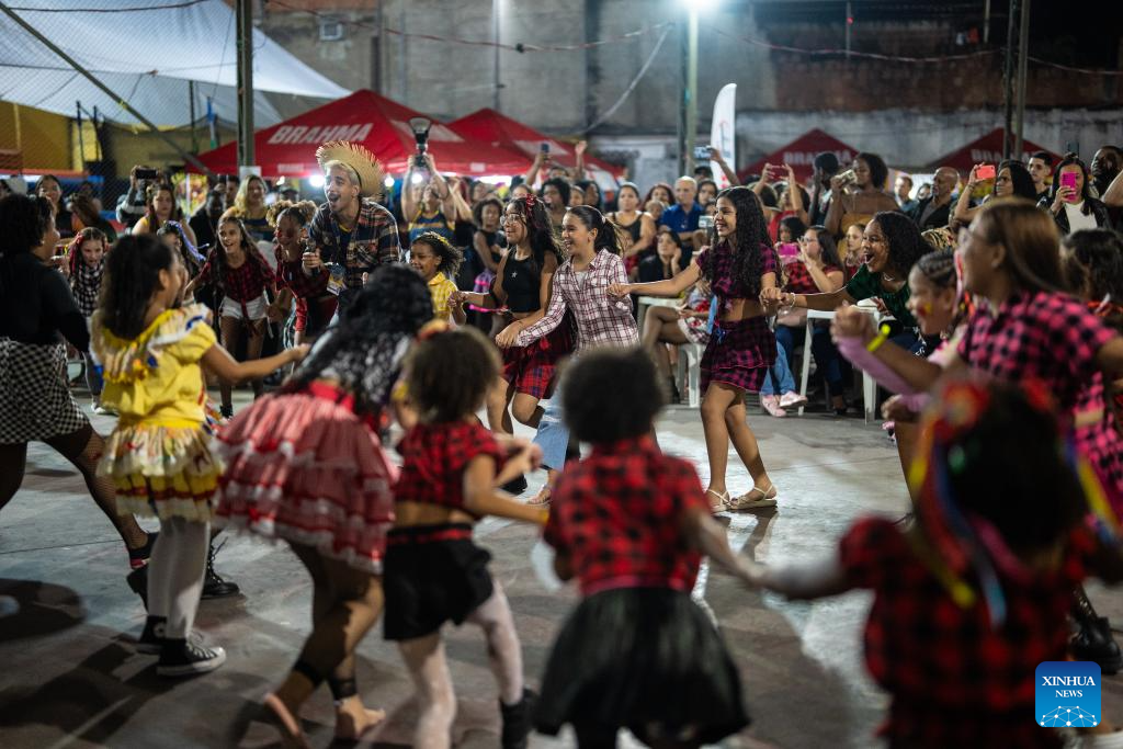 Children dressed in traditional costumes dance during a celebration of harvest in the Manguinhos community in Rio de Janeiro, Brazil, July 19, 2025. (Xinhua/Wang Tiancong)