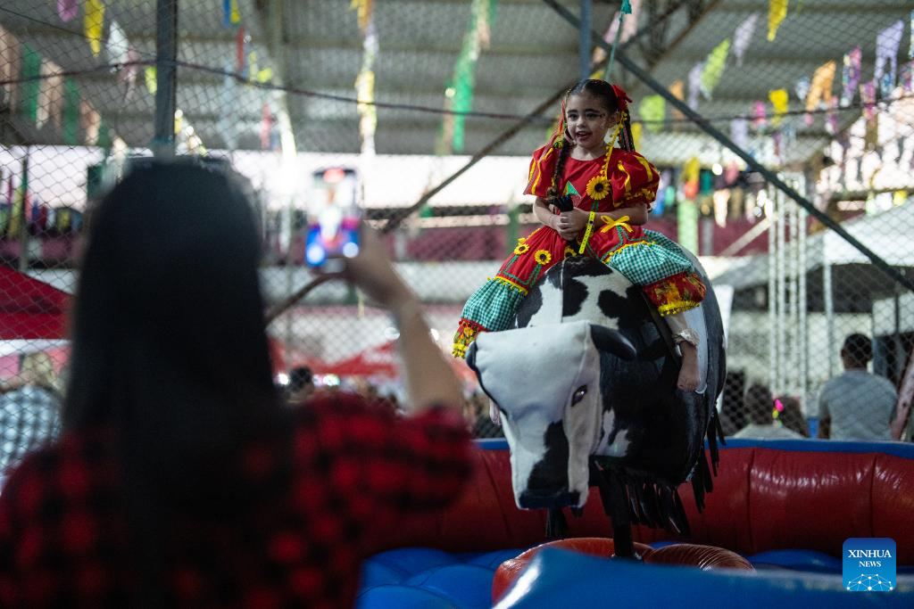 A girl rides a mechanical bull during a celebration of harvest in the Manguinhos community in Rio de Janeiro, Brazil, July 19, 2025. (Xinhua/Wang Tiancong)