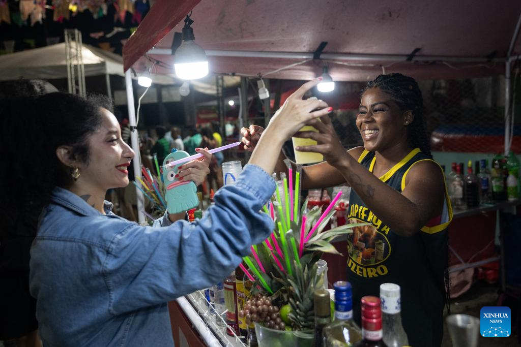 A customer buys a drink at a booth during a celebration of harvest in the Manguinhos community in Rio de Janeiro, Brazil, July 19, 2025. (Xinhua/Wang Tiancong)