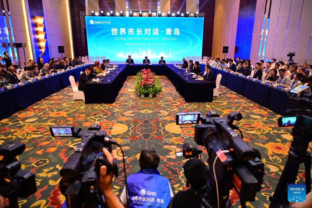 Guests exchange views at the "Global Mayors Dialogue, Qingdao" during the Qingdao International Friendship Cities Exchange Month in Qingdao, east China's Shandong Province, July 19, 2025. Qingdao International Friendship Cities Exchange Month opened here on Saturday, bringing together representatives of 19 cities and institutions from 17 countries, aiming to expand the cultural and tourism exchanges and explore paths for industrial cooperation. (Xinhua/Li Ziheng)