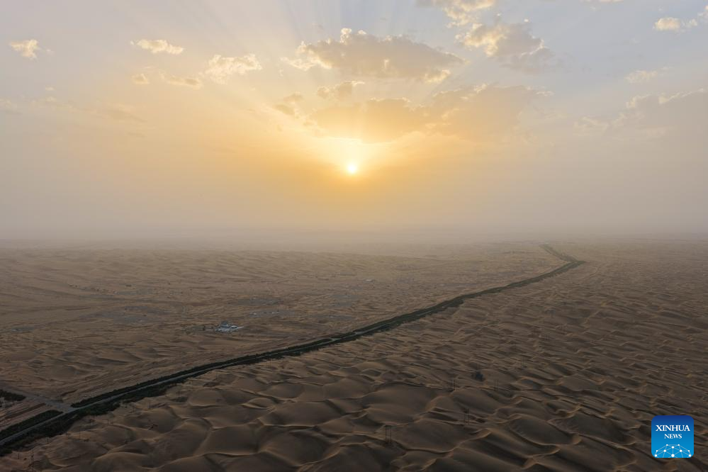 An aerial drone photo taken on July 18, 2025 shows the Tarim Desert Highway traversing through the Taklimakan Desert and the shelterbelt planted along it in northwest China's Xinjiang Uygur Autonomous Region. The 522-km highway runs across the Taklimakan Desert, the world's second-largest shifting sand desert. (Xinhua/Zhang Keren)