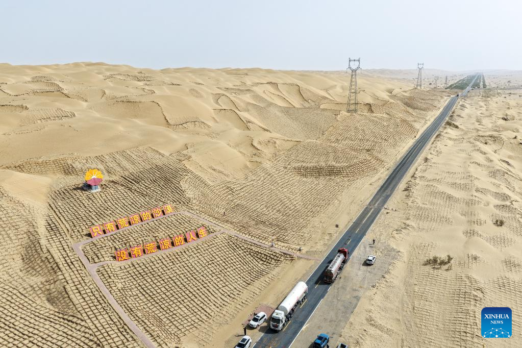 An aerial drone photo taken on July 18, 2025 shows a section of the Tarim Desert Highway and the shelterbelt planted along it in northwest China's Xinjiang Uygur Autonomous Region. The 522-km highway runs across the Taklimakan Desert, the world's second-largest shifting sand desert. (Xinhua/Meng Tao)