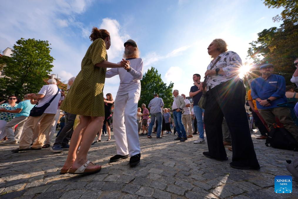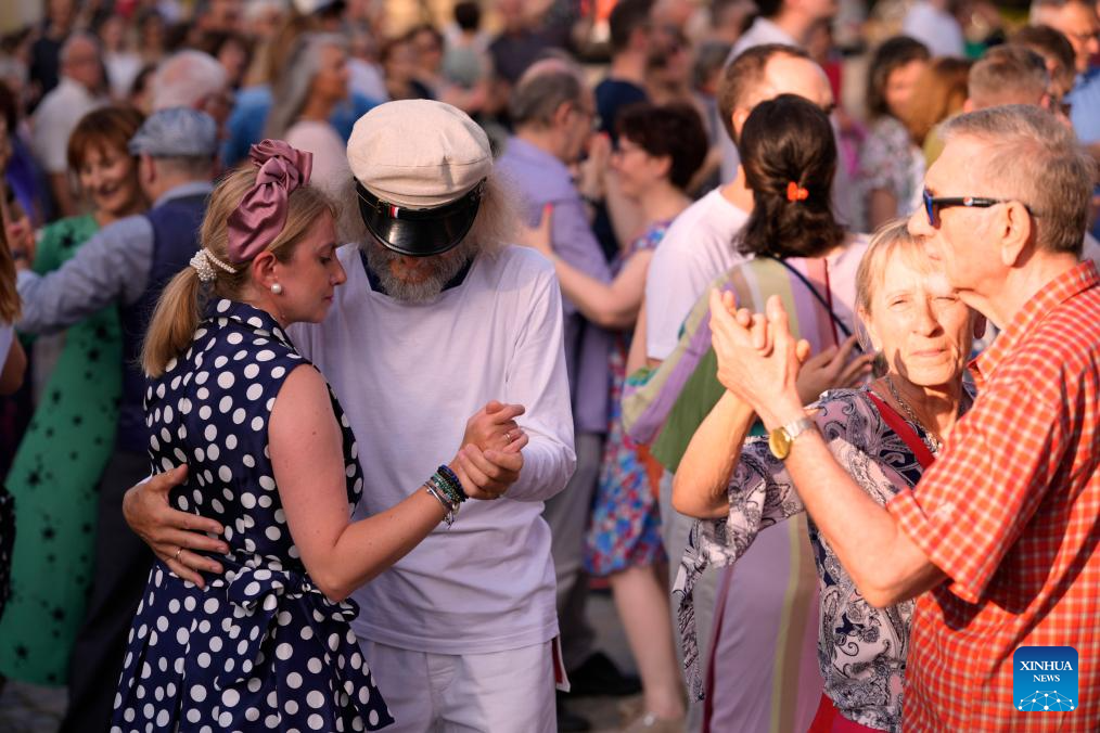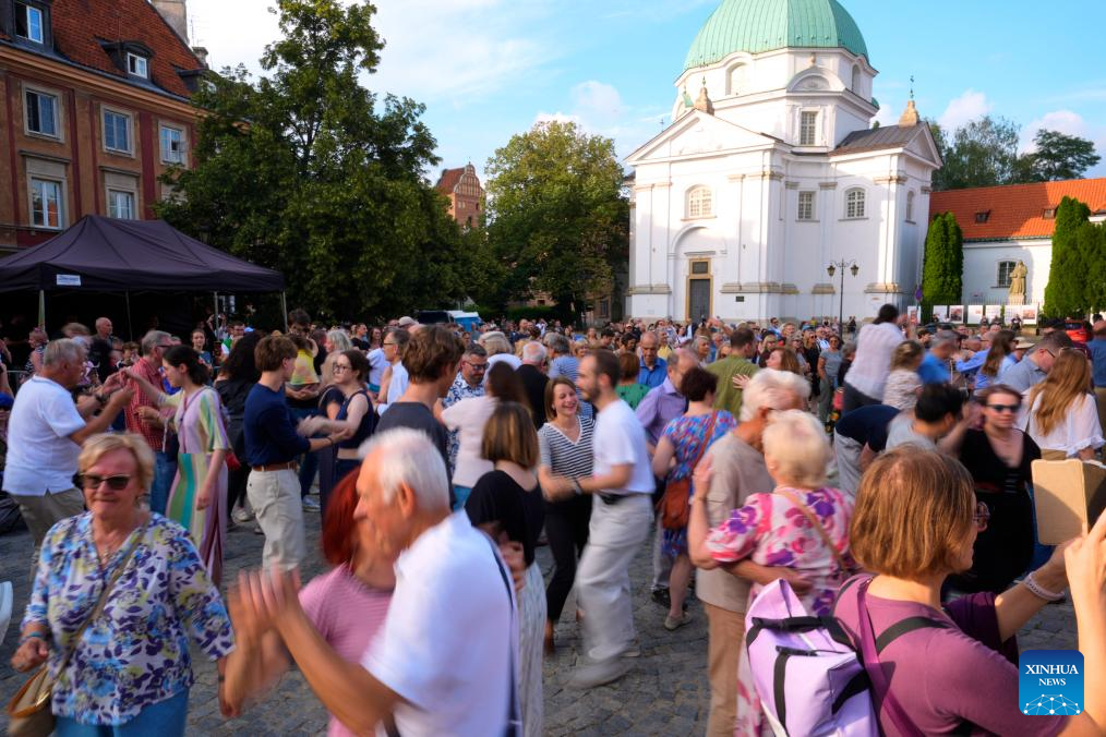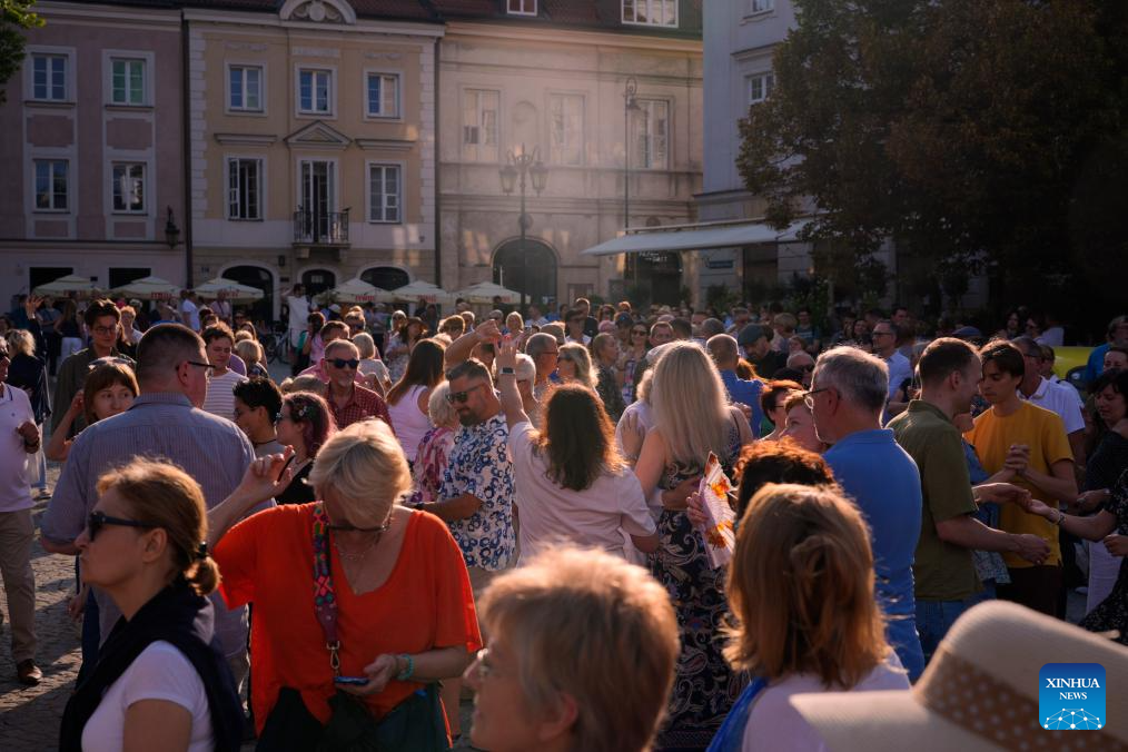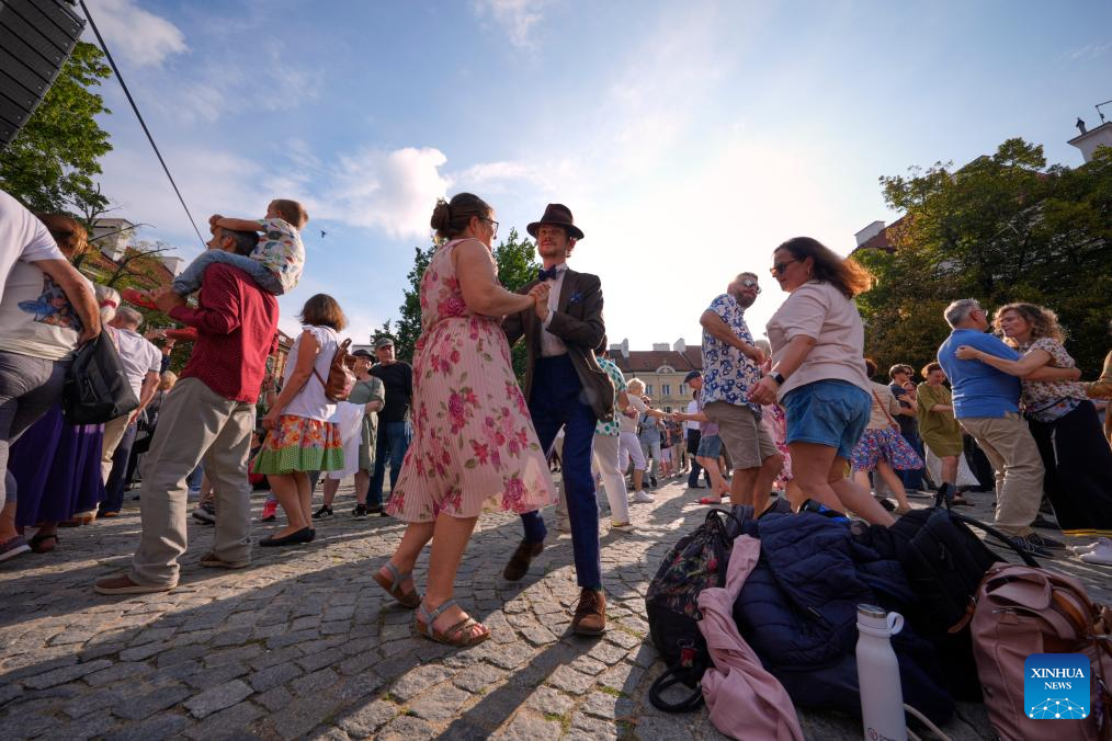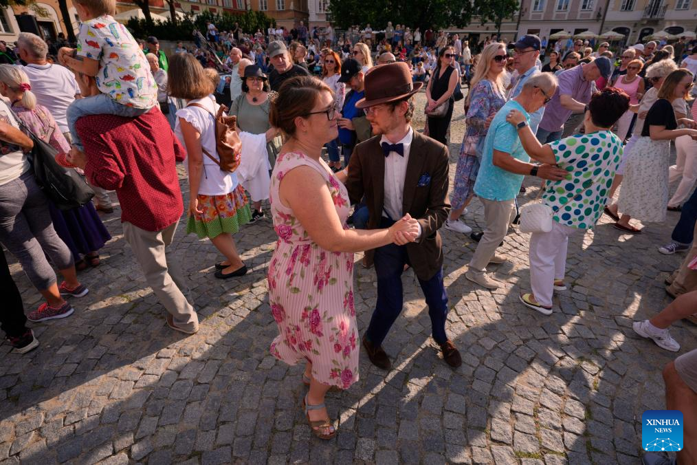 People dance to live jazz music in the Old Town of Warsaw, Poland on July 19, 2025. Warsaw on Saturday hosted a series of events, including street jazz dancing, concerts and exhibitions, to celebrate the 72nd anniversary of the post-war reconstruction of its historic Old Town. (Photo by Jaap Arriens/Xinhua)