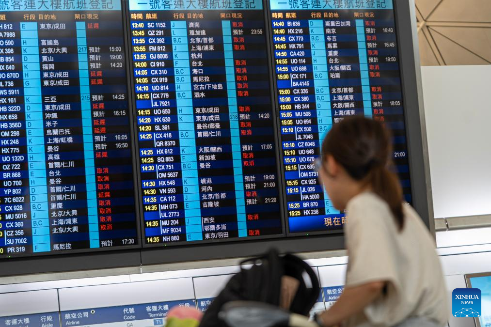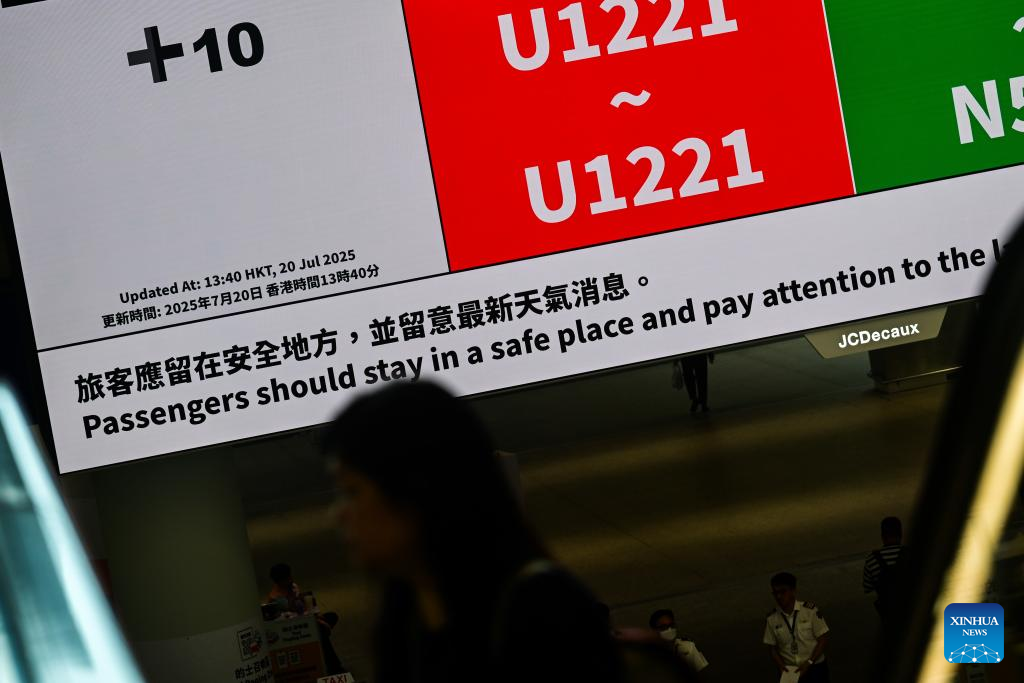 Passengers check flight information at the Hong Kong International Airport in Hong Kong, south China, July 20, 2025. Typhoon Wipha passes through Hong Kong with hurricane signal No. 10 issued, bringing severe weather and citywide disruptions.
