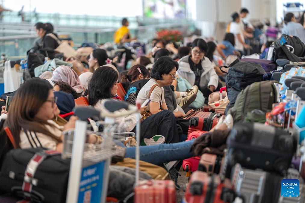 Passengers wait at the Hong Kong International Airport in Hong Kong, south China, July 20, 2025. Typhoon Wipha passes through Hong Kong with hurricane signal No. 10 issued, bringing severe weather and citywide disruptions.
